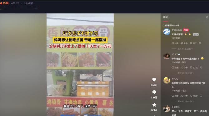 “万万没想到!”安徽,17岁男孩厌恶上学,妈妈为了教育他,带着儿子在路边摆摊,本想着让他吃点苦头懂得上学的珍贵,结果孩子却迷上了做生意,而且收益一天比一天好,短短十天不到就进账10000!妈妈瞬间有点大脑短路了。 网友:先天摆摊圣体,10天赚10000,还上什么学啊! (信息来源:观威海2024.8.29 17岁儿子不想学习,妈妈想让他吃点苦,带着一起摆摊,没想到儿子爱上了摆摊,十天卖了一万元 ) 傍晚时分,忙活了一天的邓女士又在冲着17岁的儿子发火。 自己每天风里来雨里去摆摊,为了赚钱恨不得24小时工作,可孩子倒好不是逃课就是去网吧,每天连作业都懒得写! 望着儿子烂泥扶不上墙的模样,女人气的眼泪都快下来了,突然一个想法在脑子里蹦了出来。 隔天恰好周日,邓女士一大早,便带着儿子来到了路边。 将车上的货物挨个摆好后,便叮嘱起儿子流程来。 本以为儿子会厌烦,岂料他却饶有兴致的打量起面前的炸鸡锁骨、薯条、生菜等原料,而且还耐心的记住了每个制作顺序。 不知是不是换了新面孔,当天下午,生意好的不得了。 就在邓女士忙的应接不暇时,却见儿子小刚有条不紊的刷着酱料,还笑着把炸串递到每个客人手中。 在他的三寸不烂之舌下,客人们把小摊围得里三层外三层,争着消费。天还没黑,准备好的鸡锁骨、酱料等就不够用了。 晚上,望着手机里一天的流水,邓女士眼睛都瞪圆了,儿子第一天就卖了她平日三天的量。 隔天一早,妈妈还没醒,儿子就在门外催促摆摊了。 然而,东西刚摆出来,太空中就飘起乌云,一个小时后倾盆大雨浇得衣服都要湿透了,可儿子却乐此不疲,告诉妈妈雨过天晴后客人肯定更多! 傍晚时分,城市的尘土被大雨洗净,街头涌现出一堆堆散步的人群,因为占据天时地利,邓大姐的炸串摊彻底火了。 人们争前恐后购买,香辣的肉串放进嘴里,再来上一口新鲜蔬菜,简直是绝配! 就这样,之后的一个星期里,原本不起眼的小摊子拥有了一大堆拥趸,有些人甚至还带着朋友、亲戚来光顾。 10天过去了,妈妈掏出计算器一算,儿子这段时间竟卖出了整整1万元!是往日辛苦几个月都不敢想象的。 看着手机里的钱,邓女士突然有些迷茫,于是便把自己的遭遇发到了网上,请大家给儿子指一条明路。 “10天赚一万,有这个能力还上学干嘛?直接开分店做大做强!” “这1万块是暂时的,你得考虑将来,不上学迟早会被社会淘汰” 评论区里,大家各抒己见。 不得不说,这个小孩哥在经商方面的确有天赋,嘴巴甜脑子活,而且还懂得把握天时地利,但从长远来看,要想把自己的天赋利用的淋漓尽致,基本的文化知识还是很有必要的,千万不要因为眼前小利就辍学,放弃拥抱知识的机会。 其实近年来,很多人愈发的认识到“知识并不等于财富”,甚至很多本科生,研究生乃至博士生还在为一日三餐而奔波。 而一些集团的老总,身价上亿的成功人士好多连高中学历都没有。 究其原因很简单,通往财富的路有很多条,出身、机遇、勤奋、聪明每一个都和自身有关,而不是学历、毕业证书堆出来的。 对此,你怎么看,欢迎在评论区留言、讨论。 (文中人物均为化名)