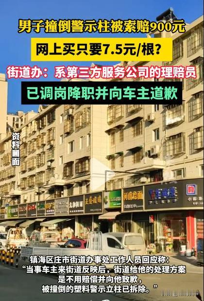 天价索赔,这算不算敲诈勒索?网上7.5元一根的塑料柱子,却被索赔900元。 浙江省宁波市某街道,一车主驾车撞倒塑料警示柱,居然被工作人员索赔900元,但网络上只卖7.5元一根。 近日,来自宁波的一位网友在网络上发视频,声称自己驾车从宁波市庄市街道某小学停车场驶出时,不慎撞倒了一个塑料警示柱,负责管理该路段的工作人员陈某联系到该车主,直接跟他索要900元赔偿金,并发给车主一个付款二维码。陈某声称:“付款截图给我就可以撤案了”,这位车主表示自己都蒙了。 针对此事,当地街道办回应称,涉事工作人员系第三方外包公司的理赔人员,目前已经将其调离岗位,还要求陈某向车主道歉。另外,根据街道办的说法,理赔人员索偿的900元中,还包含了探查费和人工费用等,合着街道办还要帮着外包公司的人,为他的明显高价索赔寻找合理依据?这实在不应该啊。 #男子撞倒7.5元警示柱被索赔9百#