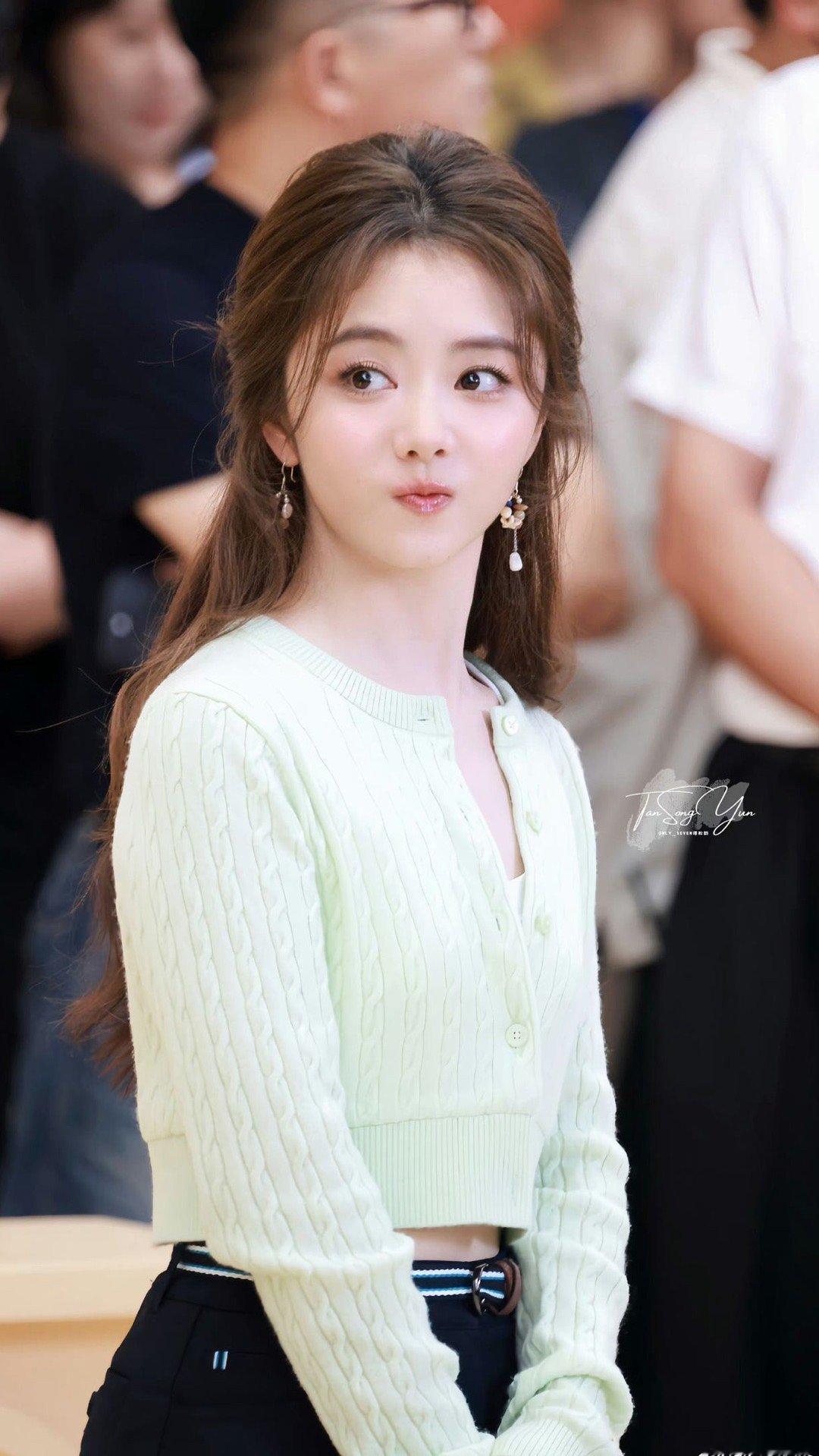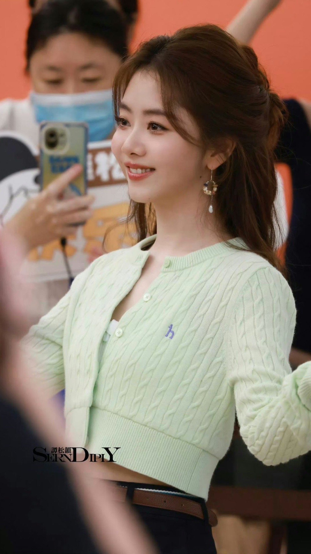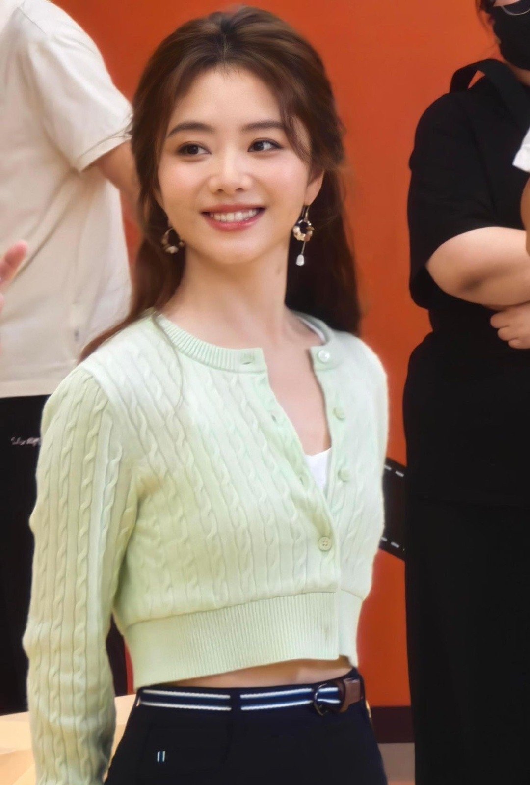 #谭松韵沈阳线下活动#今日线下活动 绿色露腰针织开衫+编发披肩,妥妥青春女大~
