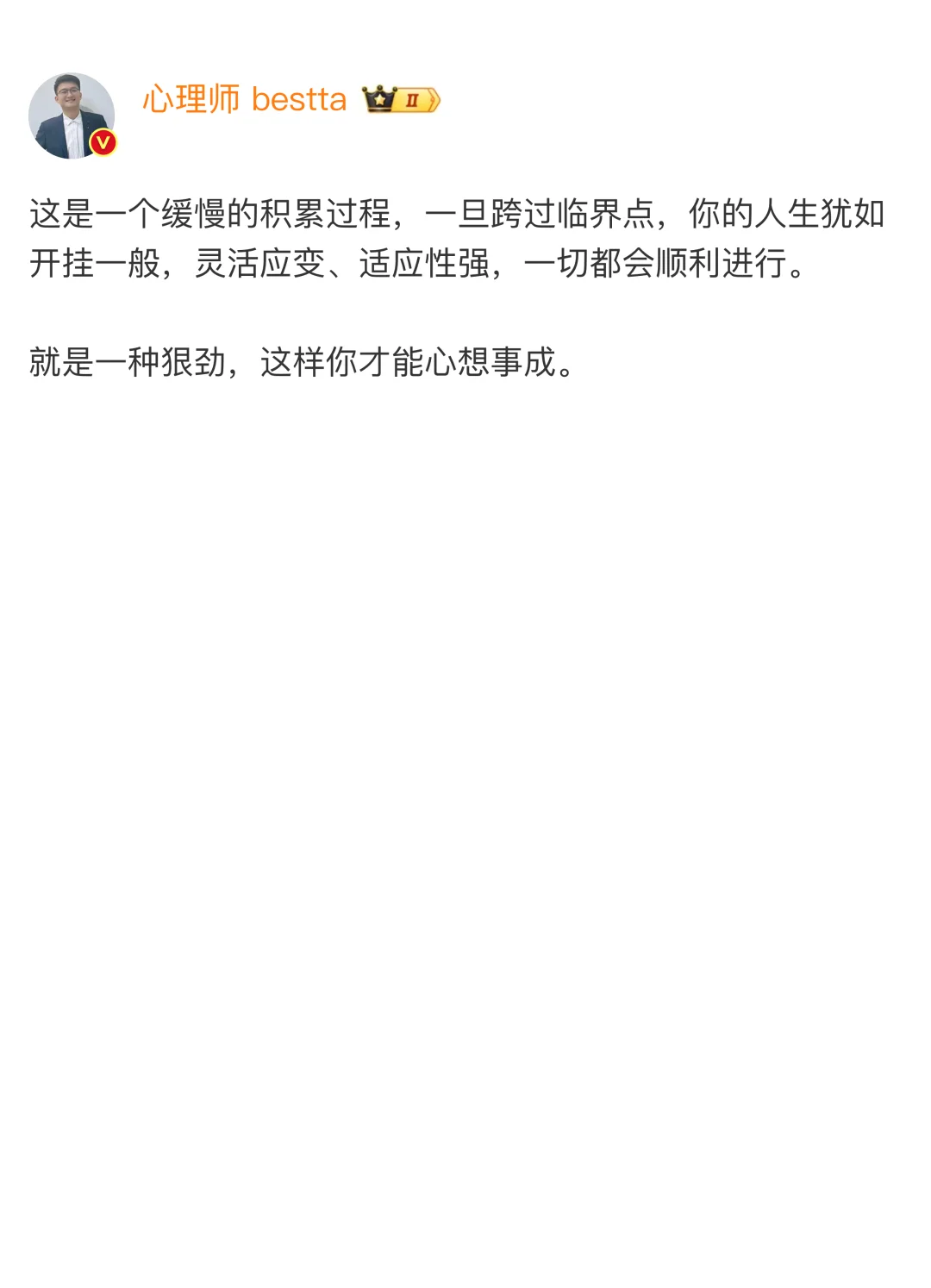 这是一个缓慢的积累过程,一旦跨过临界点,你的人生犹如开挂一般,灵活应变、适应性强,一切都会顺利进行。