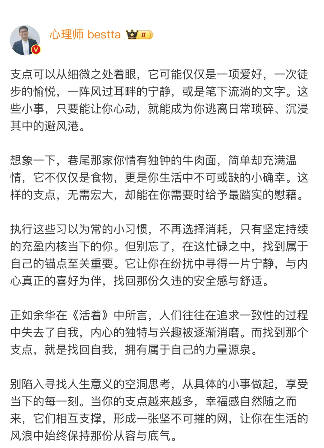 别陷入寻找人生意义的空洞思考,从具体的小事做起,享受当下的每一刻。当你的支点越来越多,幸福感自然随之而来,它们相互支撑,形成一张坚不可摧的网,让你在生活的风浪中始终保持那份从容与底气。