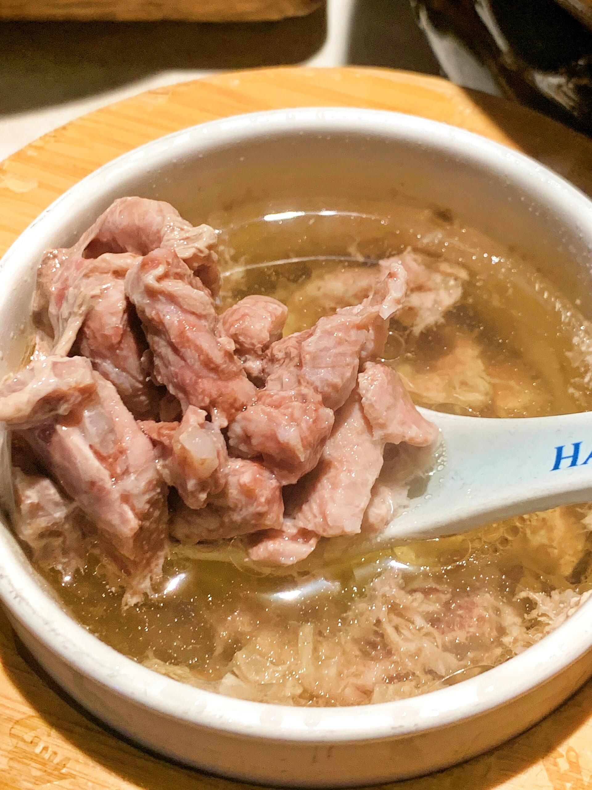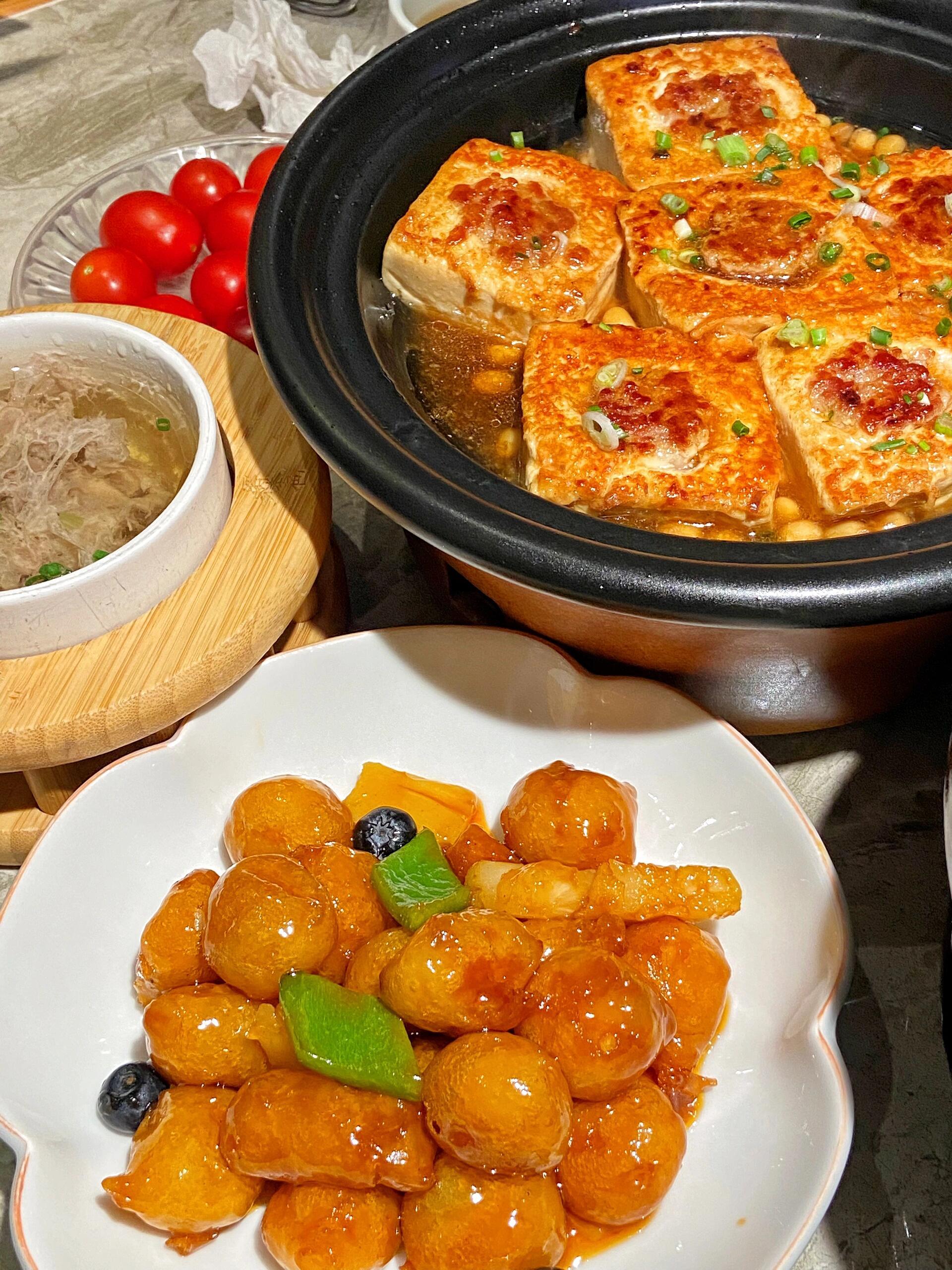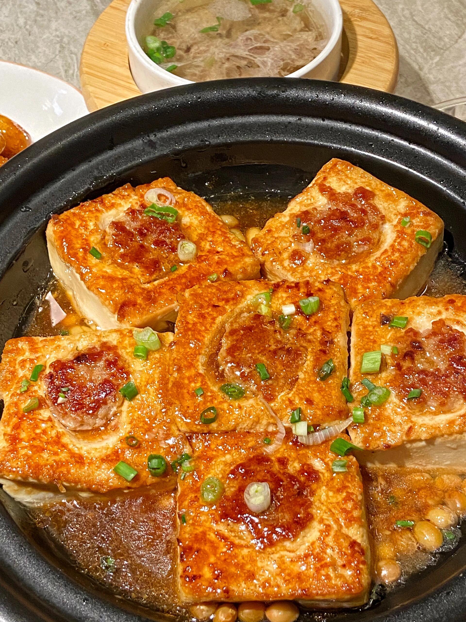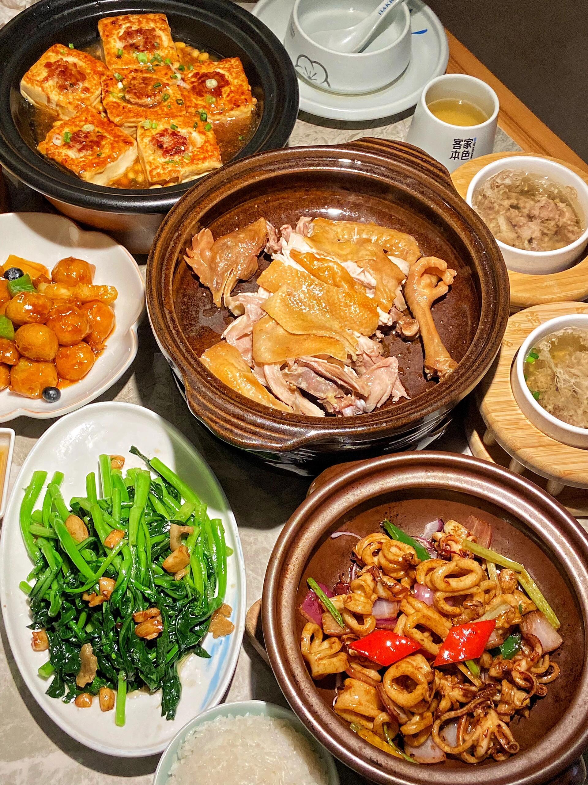 盐焗鸡必吃,肉超级鲜嫩口滑,蘸着秘制酱汁,带有一丝香油味入口,绝绝子!客家石磨酿豆腐,!豆腐中间酿了大块的肉,浸满底下的汤汁。然后再拌米饭,嘎嘎下饭;客家土猪汤,我和朋友都超爱喝这汤!用的是梅州土黑猪,撒上白胡椒粉和葱花味道超鲜美,熬出来的汤更香浓一些~