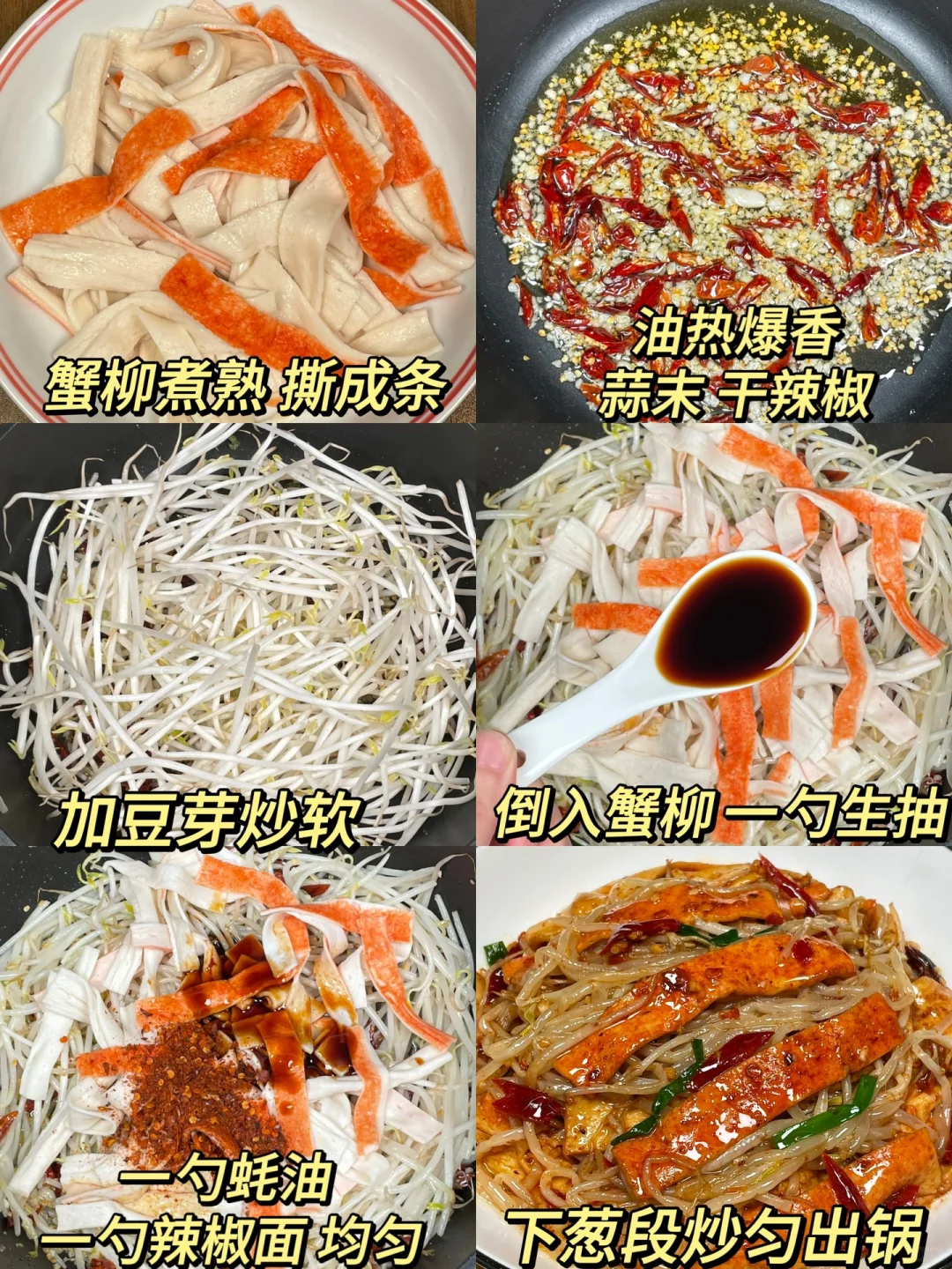快去试试豆芽炒蟹柳!一口惊艳[色色R]好好吃啊!! 香辣可口的豆芽蟹柳,清脆爽口,鲜香入味!配米饭能炫两大碗,真的巨香巨下饭!快去安排起来[黄金薯R][黄金薯R] [向右R]食材:豆芽➕蟹柳➕蒜末➕干辣椒 [向右R]做法:如图所示!