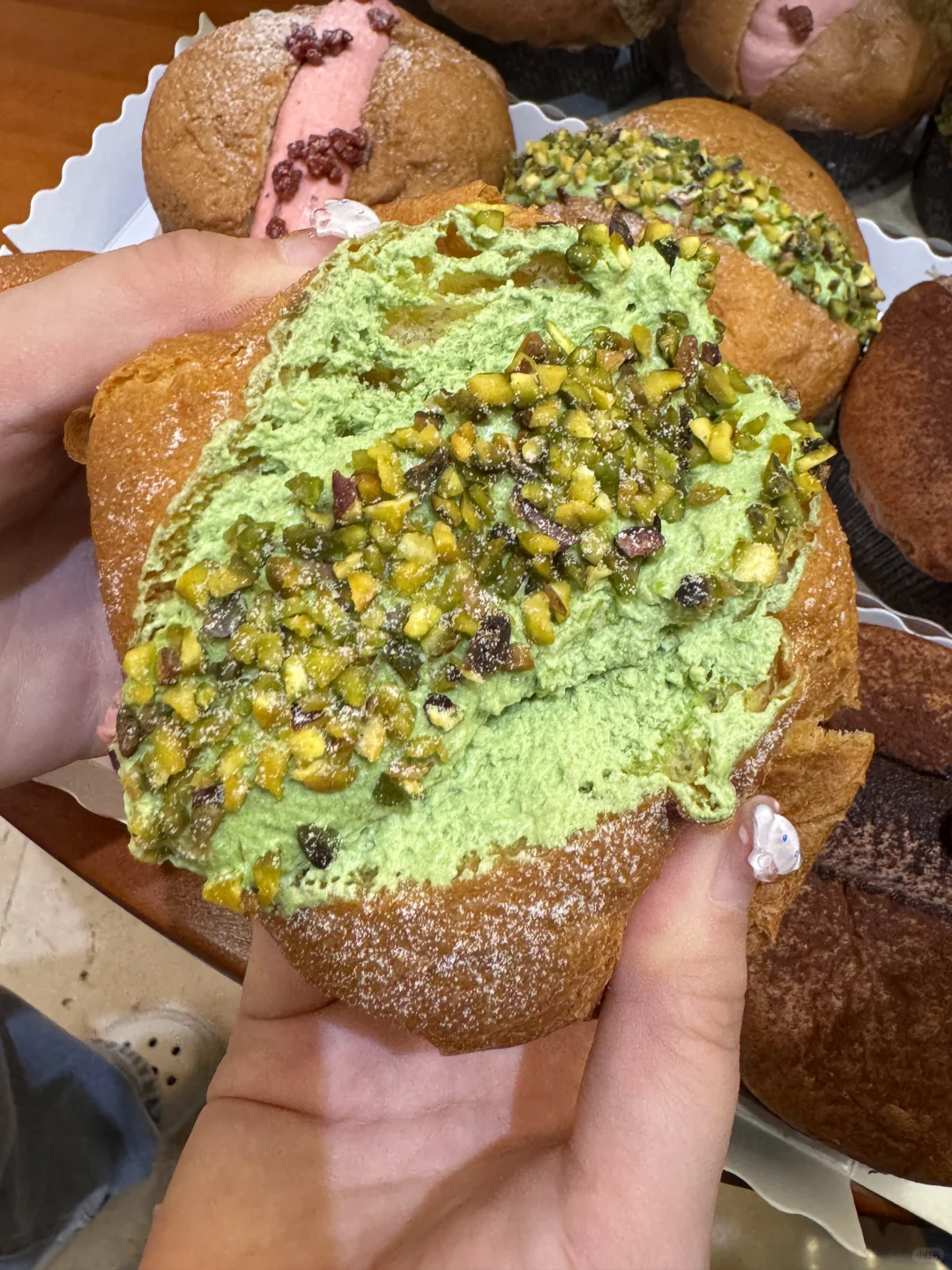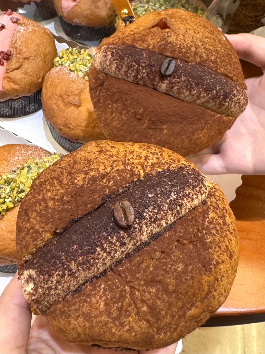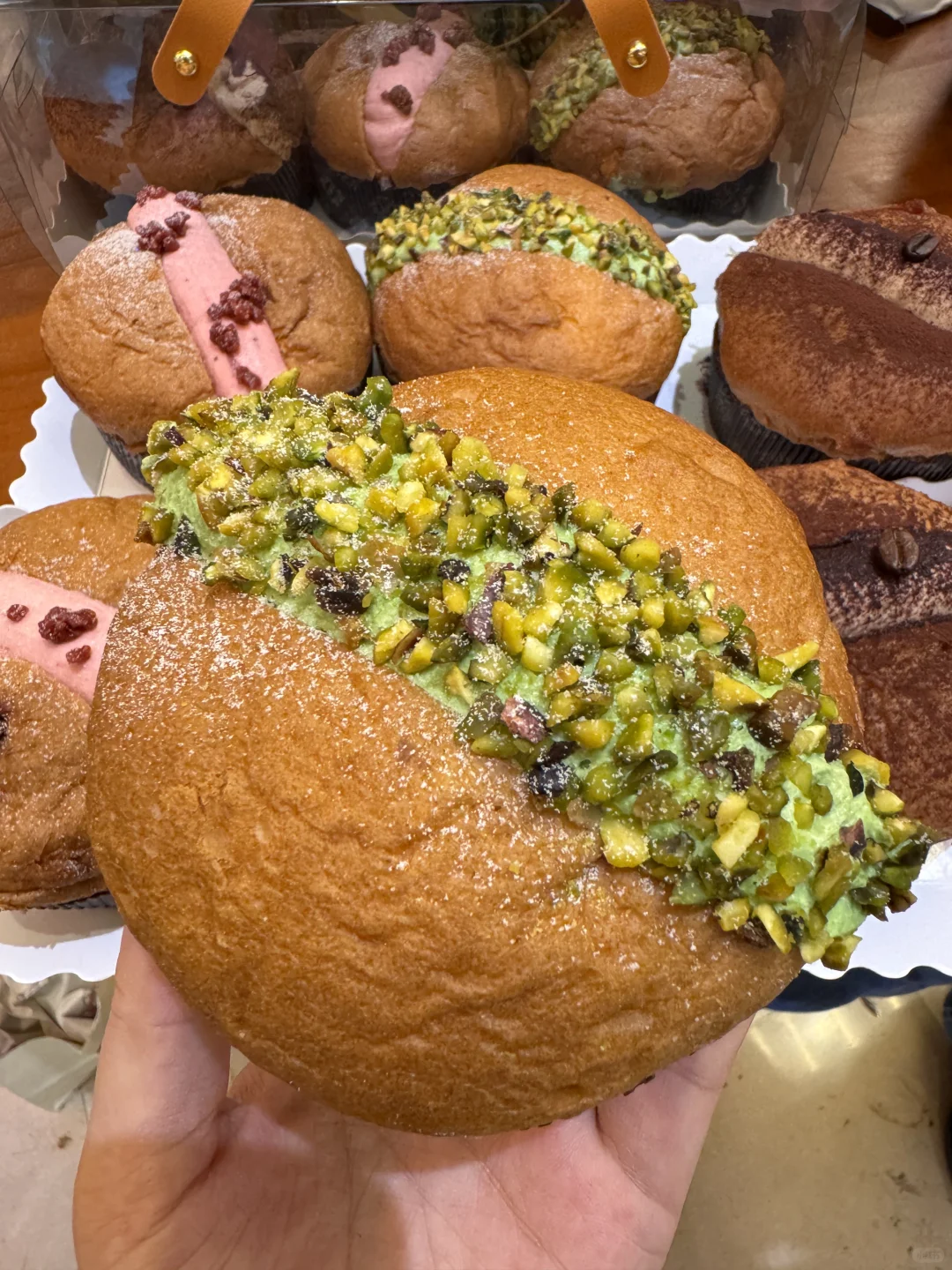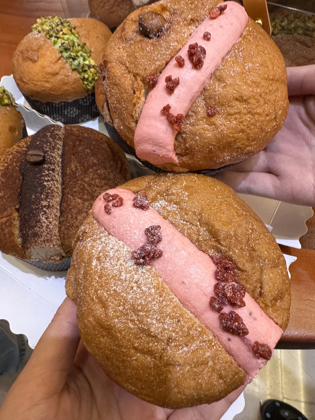 - 7楼烤布蕾店的新品,各种口味的潘纳托尼面包,现烤的面包体蓬松柔软,里面的乳酪口味也很多。草莓、开心果、咖啡。一口咬下去口感超丰富。