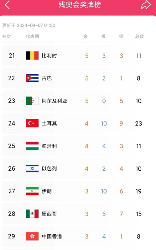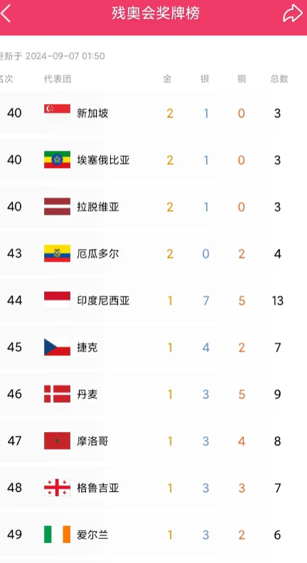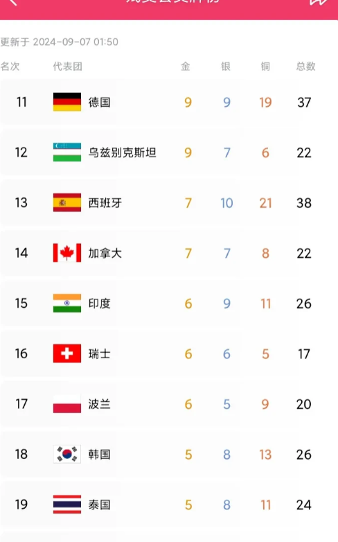 后面还有印度排名第15,算是比较意外的,韩国才排名18,中国香港排名第29,新加坡排名第40,这些都是暂时的排名,残奥会还在进行中,希望大家多关注一下。