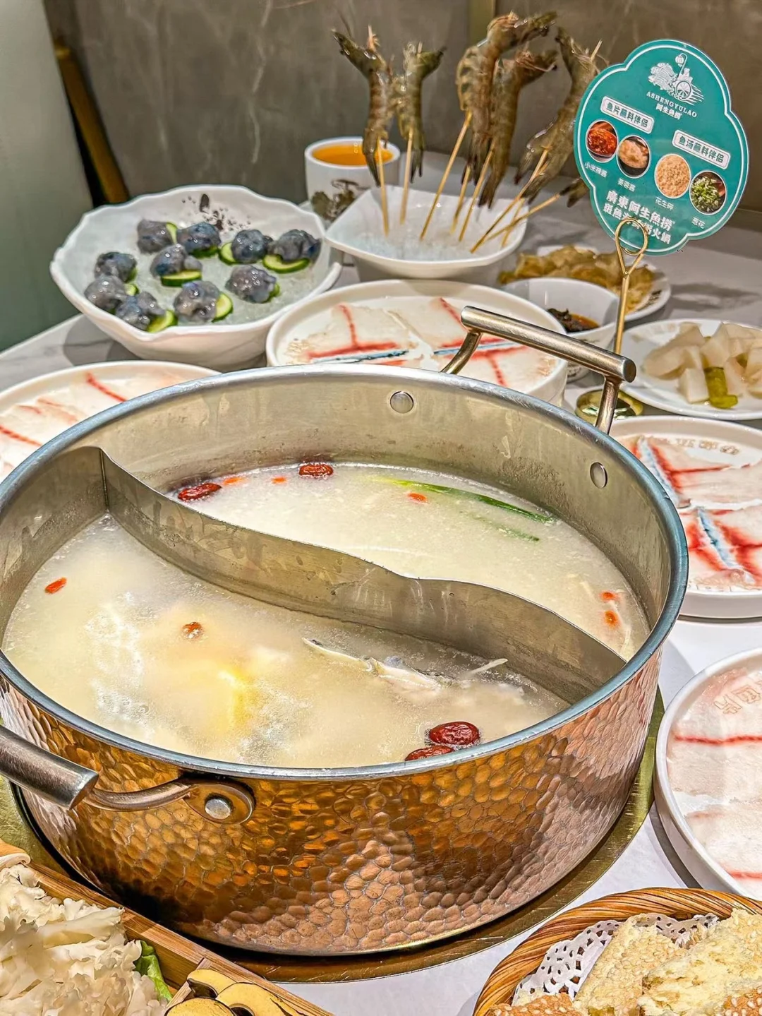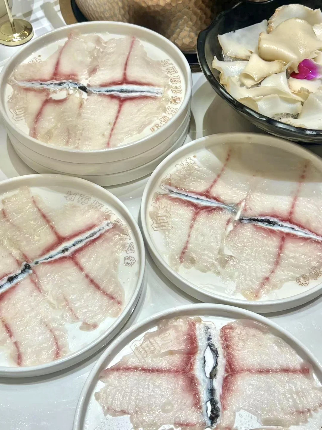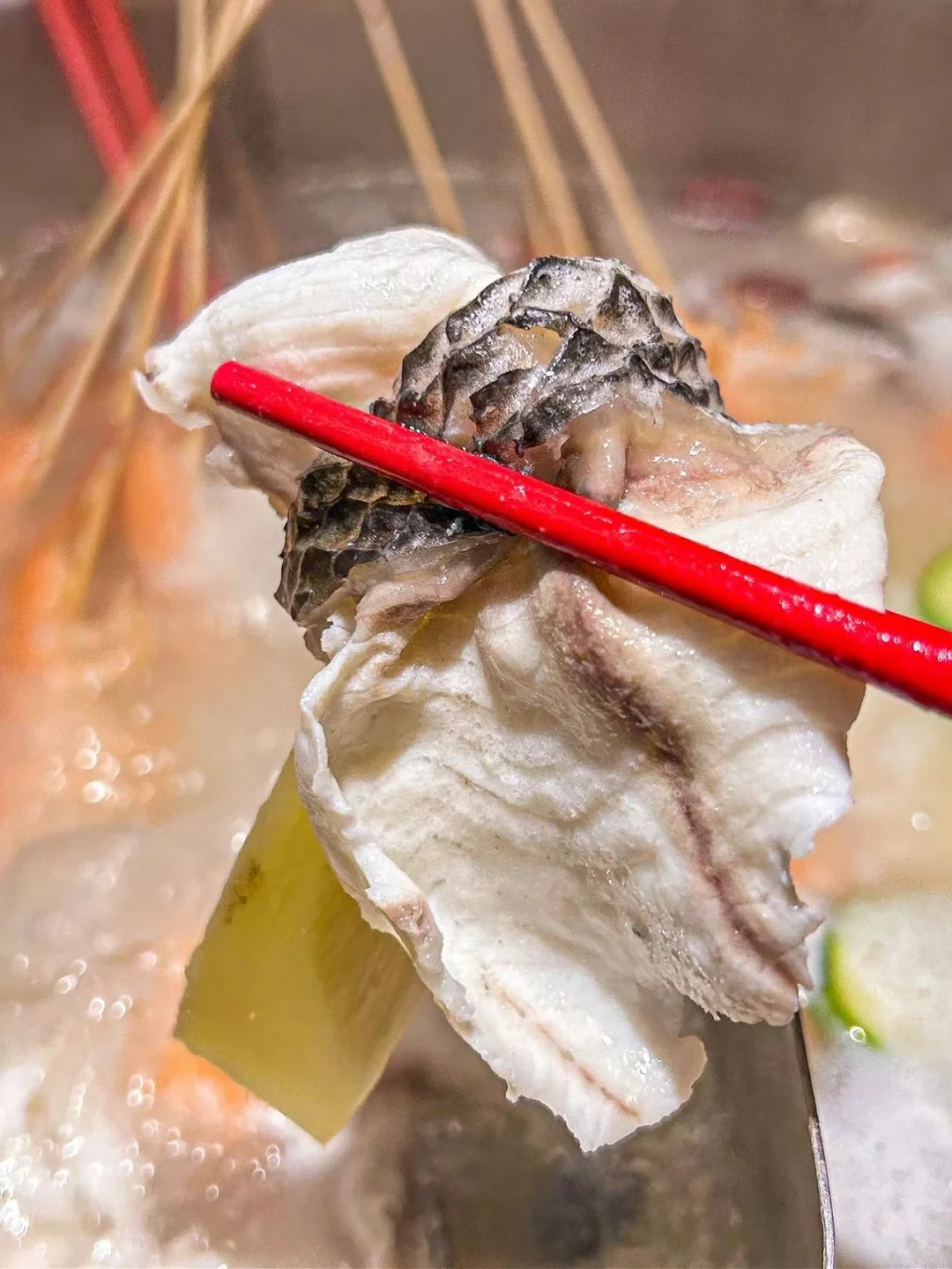 自从开来了三牌楼 一周已经吃三次了 真的建议严查一下 怎么这么好吃阿 斑鱼粥鸳鸯锅 直接拿捏我们所有人的胃 同时开动 先涮他们家精选上等斑鱼片 薄嫩油润!一点刺都没有 大口吃鱼爽歪歪 一定要蘸他们家的秘制酱料 巨有味道 - 这个锅底涮什么都好吃 都有一股鱼鲜 鲜嫩牛肉、饱满大虾、q弹虾滑、菌类…都好吃 大概30min后就能喝鱼粥 浓郁鲜美 香迷糊了