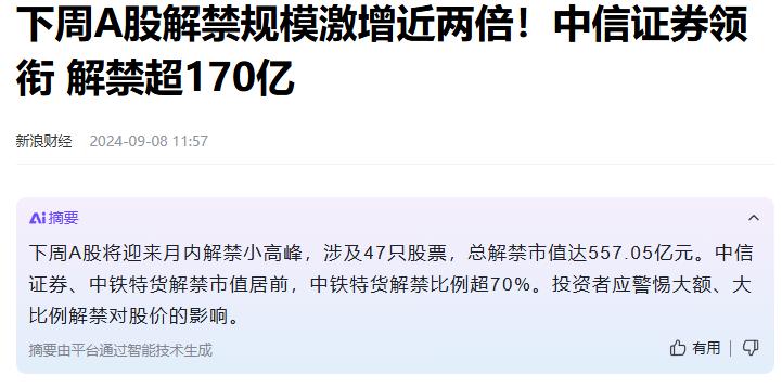 A股明天就开盘了,虎哥一点也不开心,因为又有几个利空来了,看得我头皮发麻: 第一、非农数据公布,6-7月下修,8月不及预期,美3大股指下跌,加剧民众对经济的担忧,这样不利于开盘,低开估计少不了,前15分钟估计要消化一下; 第二、A股市场将迎来月内解禁小高峰,涉及47只股票,总解禁市值达到557.05亿元。个股方面,“券商一哥”中信证券以177.51亿元的解禁市值位居榜首。另一只“百亿”解禁股为中铁特货,其解禁比例超70%。这给A股又增加了抛盘,现在的市场本身就缺流动性,最大的问题是没有增量资金接盘,现在又来抛压,中信是权重…… 第三、美国进一步加强了对量子计算、半导体制造等领域的限制,荷兰也宣布加强对光刻机的管控范围,周五晚上英伟达美科技股大跌,加上这个,虽然利好国产替代,但现在市场如此脆弱,真的不好说。 最后、中金说A股底部特征显现,你信吗?