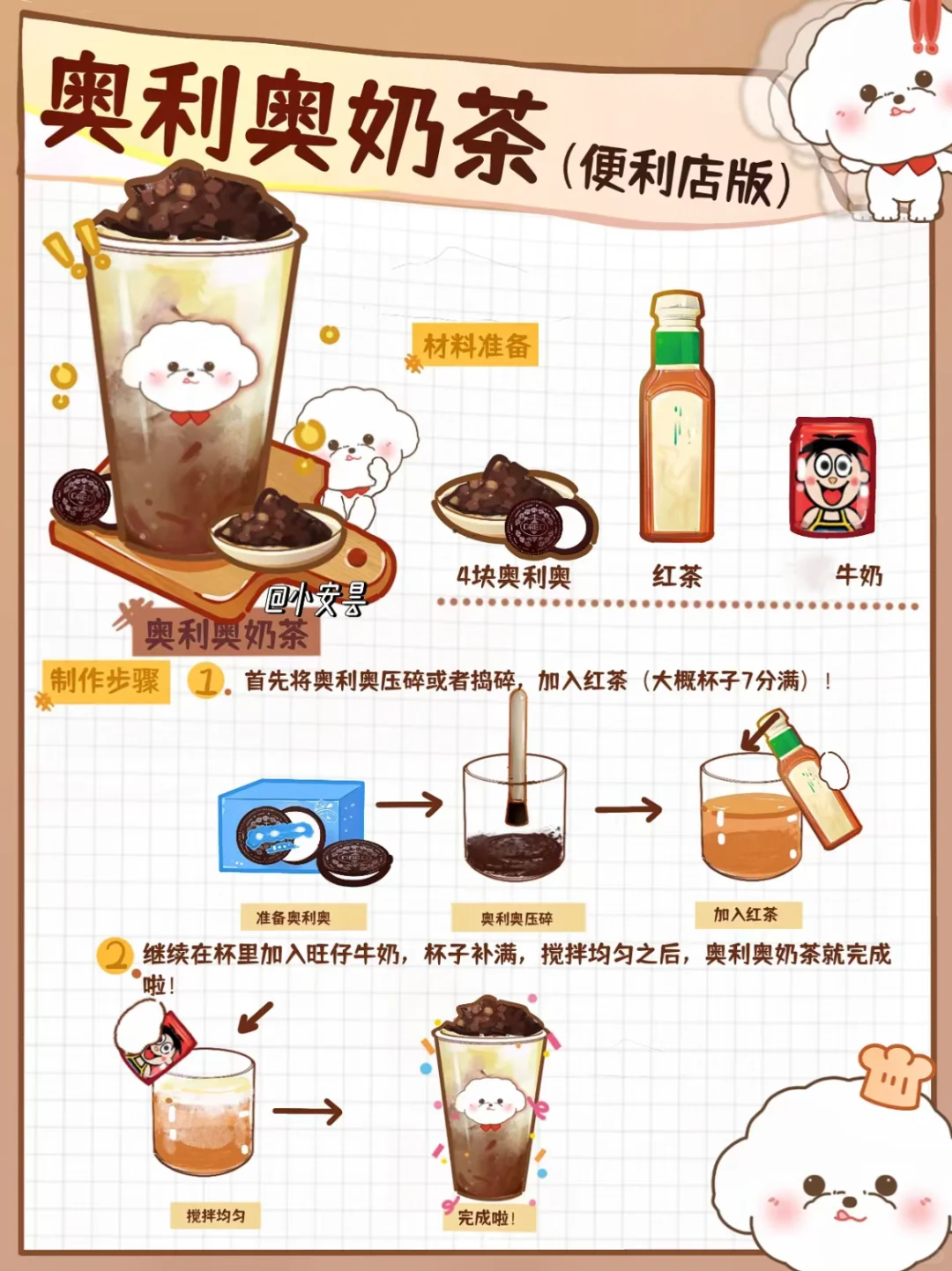 嘿,小甜心们!便利店饮品自制奥利奥奶茶🥤配方来啦 某奶茶的平替~ 只需奥利奥饼干、红茶和牛奶,就能轻松制作出美味奶茶啦!🍪☕️🥛 🥣制作食材 4块奥利奥 ➕红茶 ➕旺仔牛奶 🥣制作步骤 1⃣️首先将奥利奥压碎或者捣碎,加入红茶(大概杯子7分满)! 2⃣️继续在杯里加入旺仔牛奶,杯子补满,搅拌均匀之后,奥利奥奶茶就完成啦! 只需要简单的三步操作,就能享受饱满的奶茶滋味,这个DIY简直不能再满足!如果你也是奶茶控,别错过了!✨