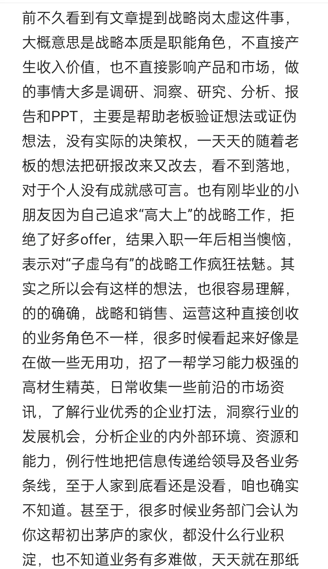 前不久看到有文章提到战略岗太虚这件事,大概意思是战略本质是职能角色,不直接产生收入价值,也不直接影响产品和市场,做的事情大多是调研、洞察、研究、分析、报告和PPT,主要是帮助老板验证想法或证伪想法,没有实际的决策权,一天天的随着老板的想法把研报改来又改去,看不到落地,对于个人没有成就感可言[笑哭R]
