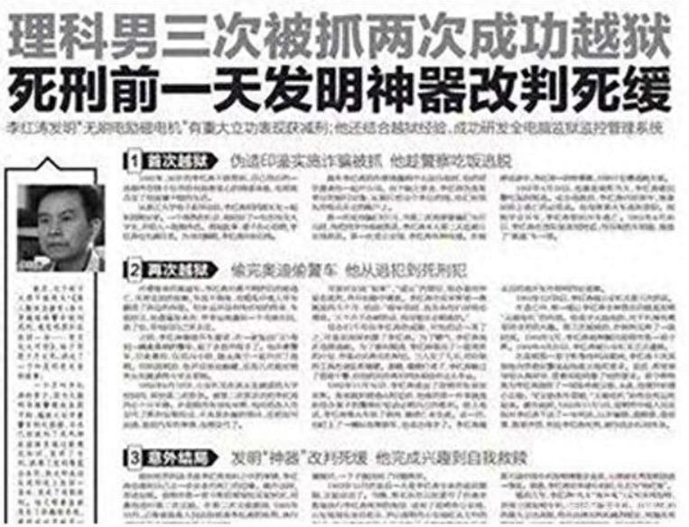 在阴冷的牢房里,李红涛颤抖的双手紧握手里的模型,这个不起眼的小东西,也随即成了他的免死金牌。 李红涛的名字在科技界几乎如同传奇一般,他的发明——一种革命性的无刷电励磁电机,不仅在电机技术领域掀起了巨大的波澜,还极大地推动了整个工业应用的效率和可靠性的飞跃。 这项技术通过精确控制电机中的磁场,显著提高了电机的性能和能效,成为了现代工业自动化和电气驱动领域的重要基石。 李红涛凭借此项技术,荣获了多个国内外专利,以及众多颇具分量的科技奖项,成为科技界的宠儿,也让他成为众多高科技企业争相聘请的宝贵财富。 然而,李红涛出狱后的生活故事同样震撼人心,他的技术成就是在一段极不寻常的人生经历中孕育而成的。 在监狱中,面对即将到来的死刑宣判,他没有选择绝望,而是通过不懈的努力和学习,利用自己深厚的专业知识和技术能力,发明了改变世界的技术。 这不仅为他赢得了减刑的机会,更重要的是,他的发明为社会带来了前所未有的科技进步,这一切充分证明了人类潜力的无限性,以及知识与创新力量的巨大价值。 然而,李红涛的一生并非全程顺风顺水,他的犯罪历程令人震惊,一个充满希望的优秀大学生,怎会逐步堕入多次越狱的死刑犯的深渊? 事实上,李红涛的学术生涯起始于浙江大学电子系,那是一个充满光明和希望的起点,但不幸的是,一系列错误的选择和决策最终导致了他人生轨迹的根本性转变。 从最初的伪造印章诈骗银行开始,到为了逃避法律的追捕而屡次越狱,每一个决策的背后,都是他步步深入的罪恶之路。 李红涛的早年生活和教育背景呈现出复杂多层次的特征,他出生在一个高度重视知识和教育的家庭中,父母都是学术界的知识分子,深刻理解教育对于个人未来的决定性影响。 从小,李红涛就展现出了超越同龄人的学习能力和对科技的浓厚兴趣,他的父母寄望于他能够利用自己的才能和知识,为社会作出贡献,成为未来的社会栋梁。 然而,人生的道路并非总是一帆风顺,在成长的过程中,李红涛面临了诸多挑战和诱惑,这些考验最终引导他做出了一些与早年培养的价值观背道而驰的决策。 这些选择不仅改变了他的个人命运,也对他的家庭和所爱之人造成了极大的伤害,在他的故事中,我们看到了一个才华横溢的年轻人如何在生活的阴影中迷失方向,最终走上了犯罪的道路。 在监狱中,李红涛的人生达到了一个转折点,面对即将来临的死亡威胁,他并没有选择放弃,而是决定用自己的知识和创造力争取生存的机会。 在这段极限生存的压力下,他不仅重新找到了自我,还在科技领域取得了突破性的成就。 他的坚持和努力最终使他赢得了科技界的尊重,并为他赢得了减刑的机会,他的这段经历深刻地展示了人类在绝境中反击命运的力量。 李红涛的故事是失败、救赎与重生的缩影,这个故事不仅仅是对他个人经历的回顾,更是对我们所有人在面对生活选择时的一种深刻启示。 它告诉我们,无论一个人的起点如何,通过不懈的努力和坚定的决心,总是有机会改变自己的未来,尽管他的犯罪行为是不可取的,但他在困境中所展现的创新精神和不屈不挠的态度却是值得我们每个人学习的。 信息来源:海南特区报,2016-09-18,理科男2次成功越狱 死刑前天发明“神器”被改判死缓