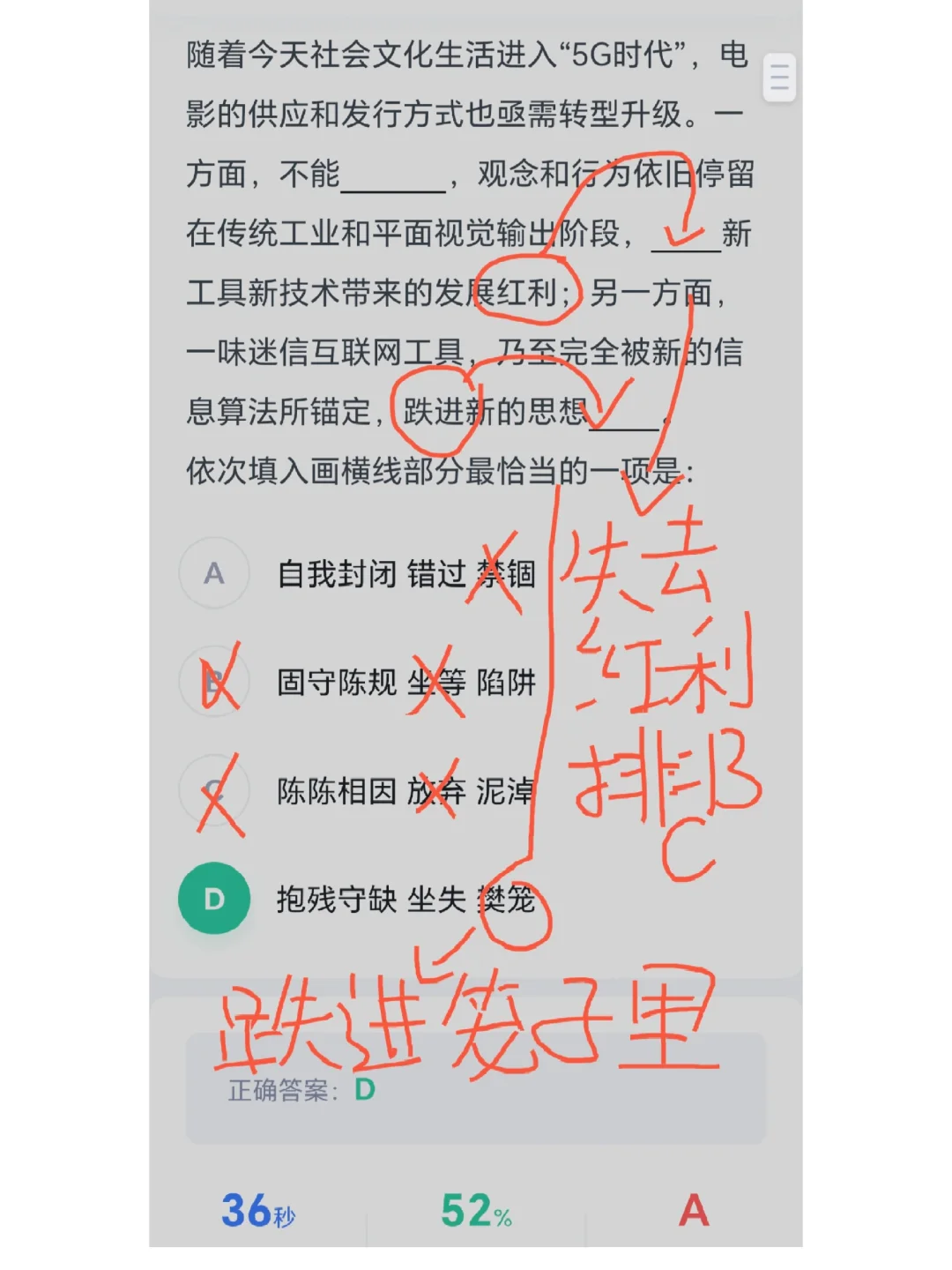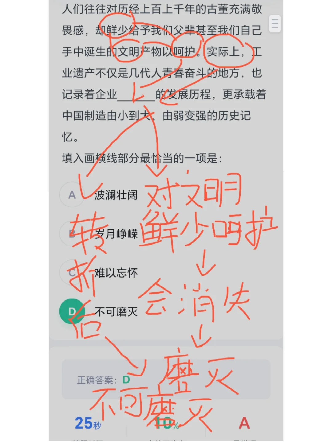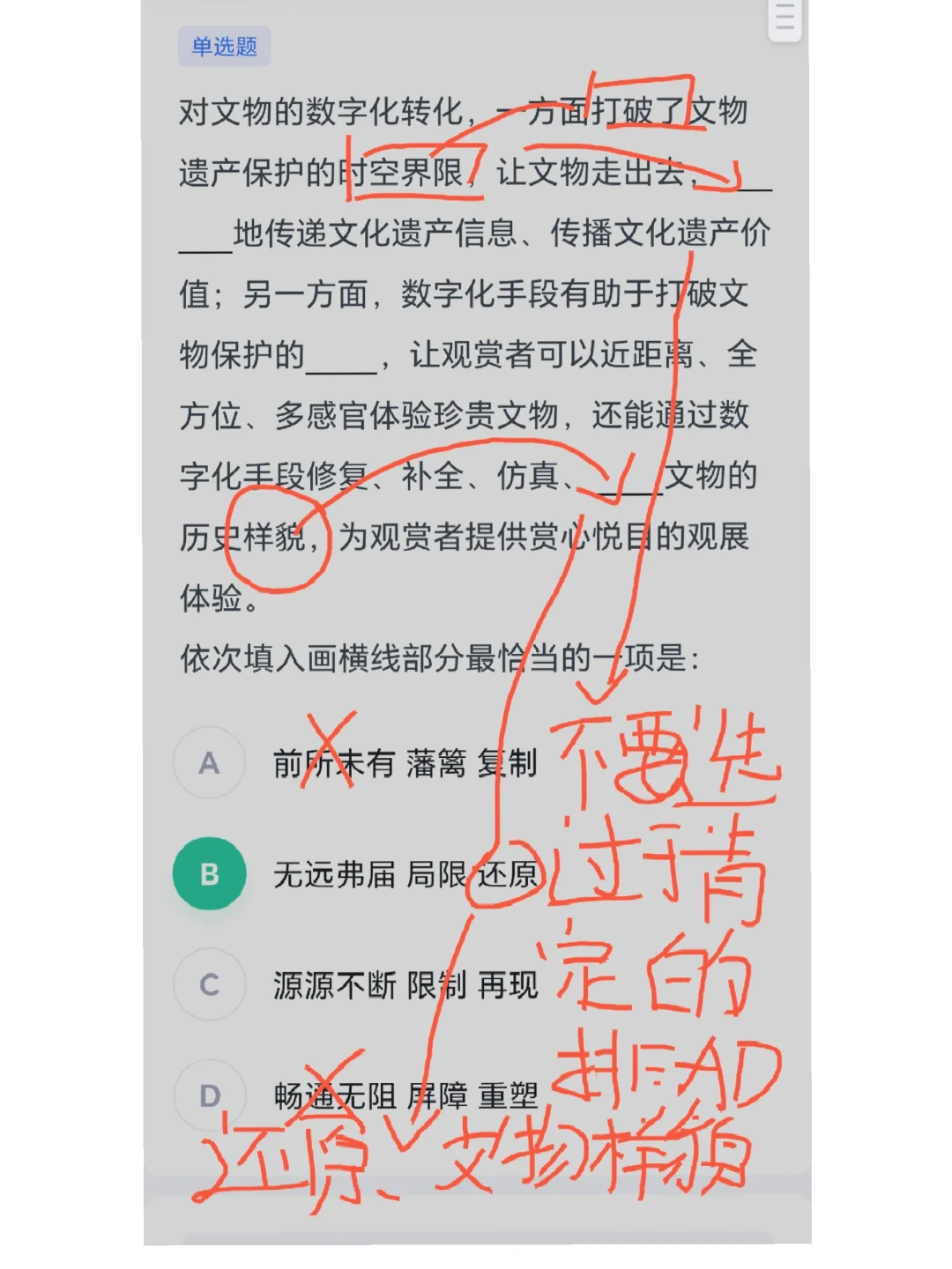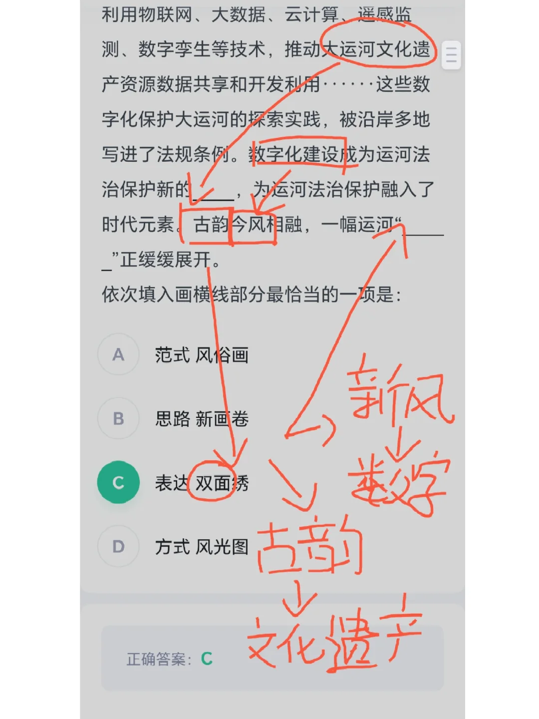 逻辑填空就用野路子! 1.对文明鲜少呵护=会消失=磨灭 实际上=转折=不可磨灭 2.从第二空入手 失去红利排BC 从跌进可以看出是跌进笼子里 总不能跌进禁锢吧 3.关系图=反映某种趋势 4.多元共生=异彩 效仿=趋之若鹜 5.是中国人发明或创造都可以 但下面适用于不同需求=灵活运用 6.无关痛痒又带引号=柔 7 大运河文化遗产=古韵 数字化=新风 古韵与新风=双面绣