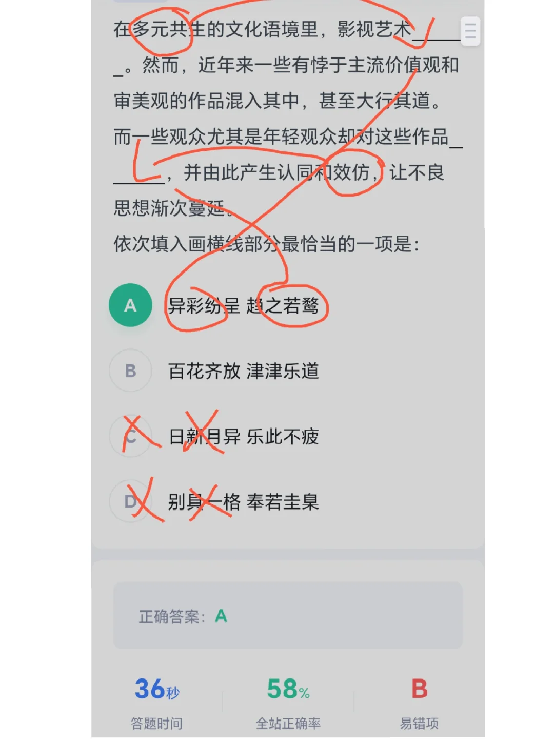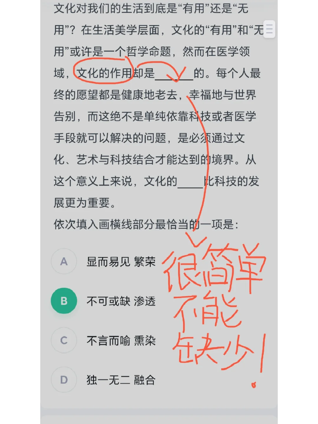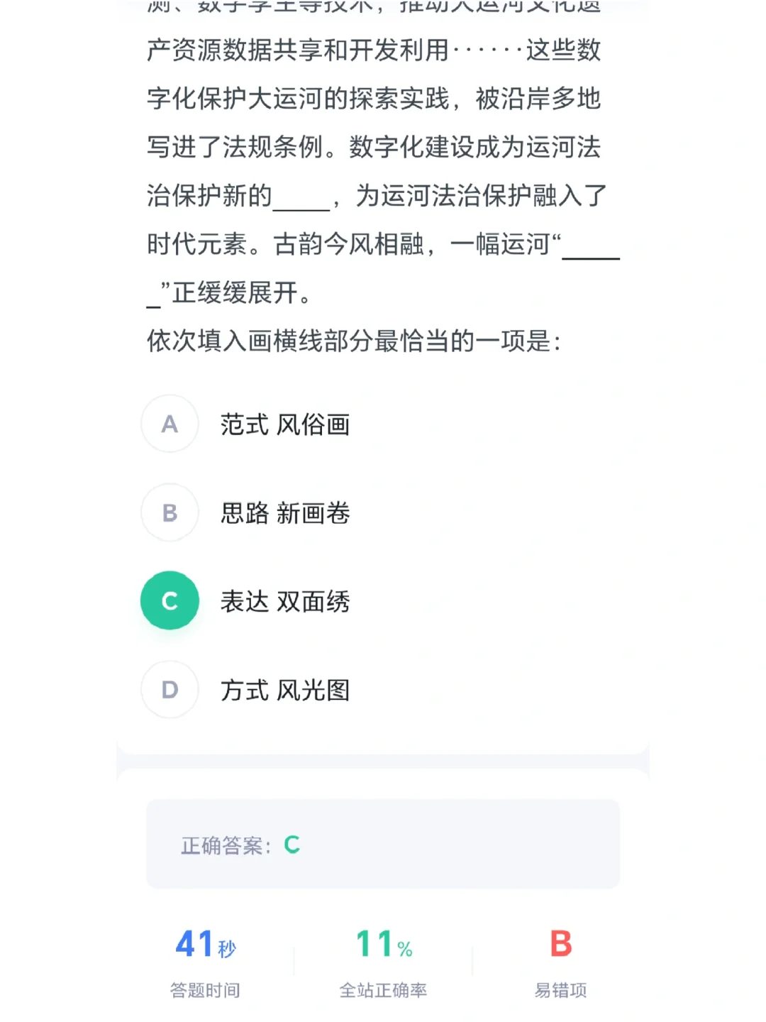 逻辑填空就用野路子! 1.对文明鲜少呵护=会消失=磨灭 实际上=转折=不可磨灭 2.从第二空入手 失去红利排BC 从跌进可以看出是跌进笼子里 总不能跌进禁锢吧 3.关系图=反映某种趋势 4.多元共生=异彩 效仿=趋之若鹜 5.是中国人发明或创造都可以 但下面适用于不同需求=灵活运用 6.无关痛痒又带引号=柔 7 大运河文化遗产=古韵 数字化=新风 古韵与新风=双面绣