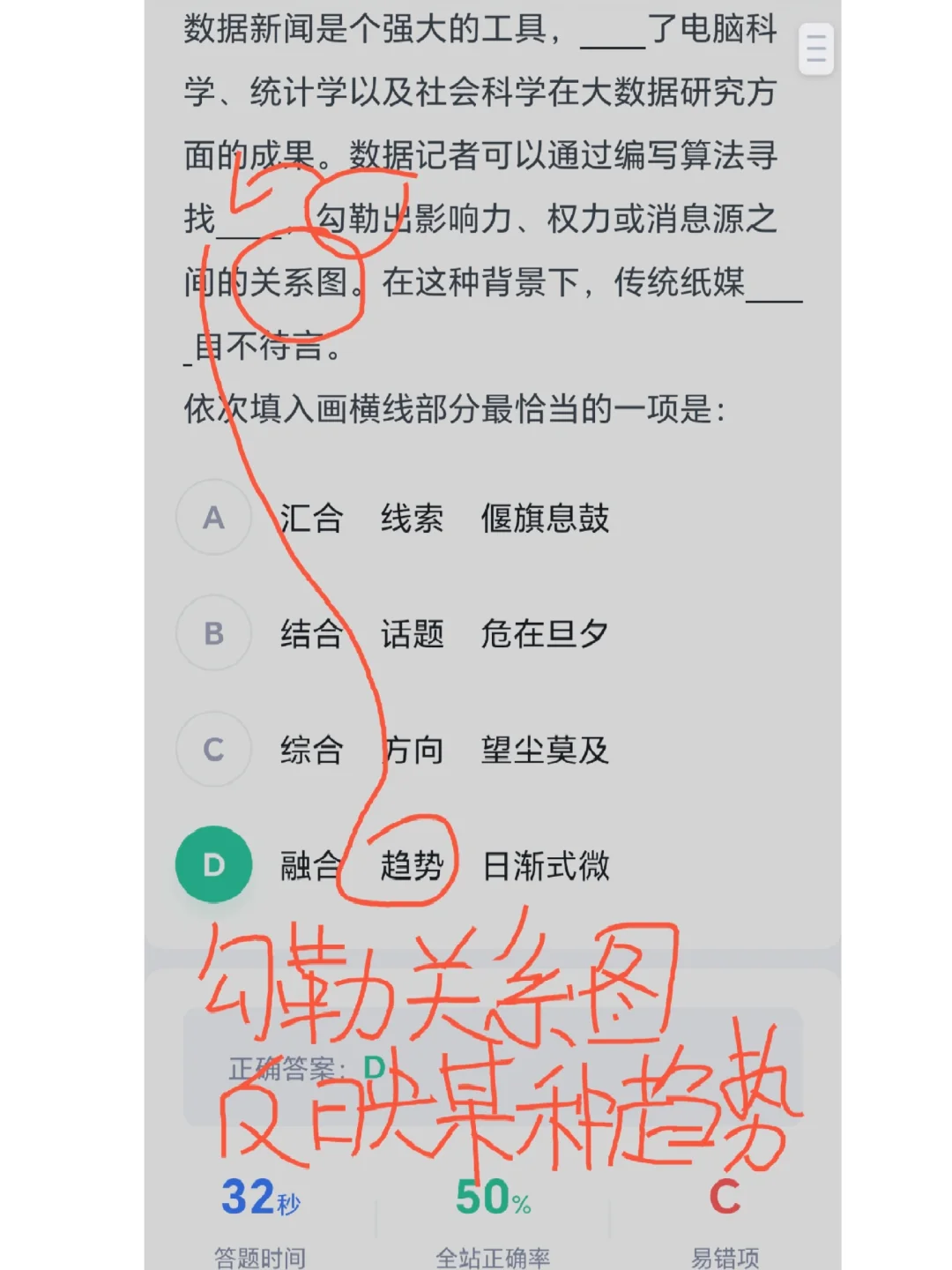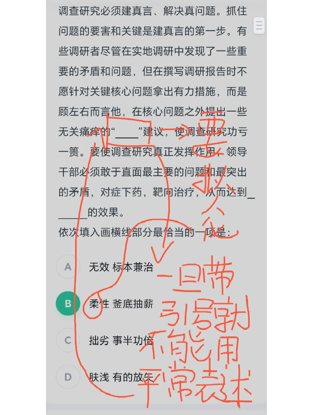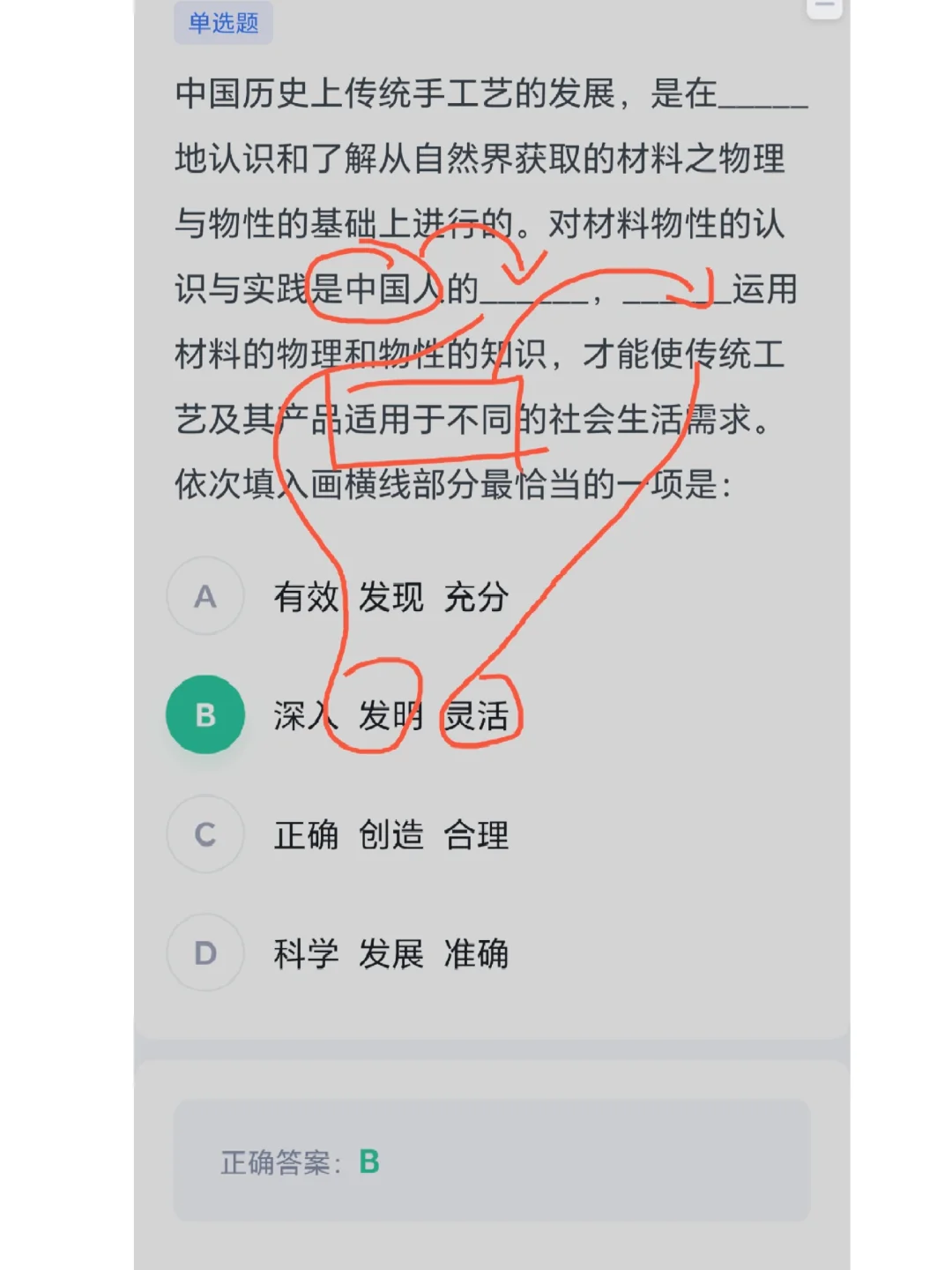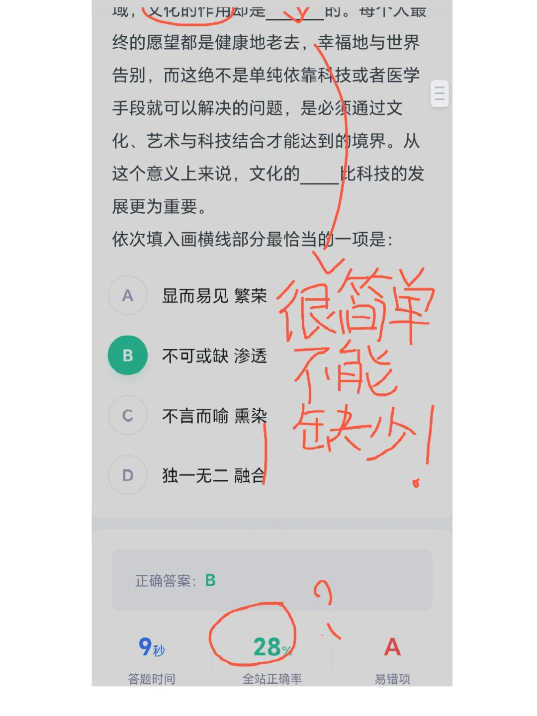 逻辑填空就用野路子! 1.对文明鲜少呵护=会消失=磨灭 实际上=转折=不可磨灭 2.从第二空入手 失去红利排BC 从跌进可以看出是跌进笼子里 总不能跌进禁锢吧 3.关系图=反映某种趋势 4.多元共生=异彩 效仿=趋之若鹜 5.是中国人发明或创造都可以 但下面适用于不同需求=灵活运用 6.无关痛痒又带引号=柔 7 大运河文化遗产=古韵 数字化=新风 古韵与新风=双面绣