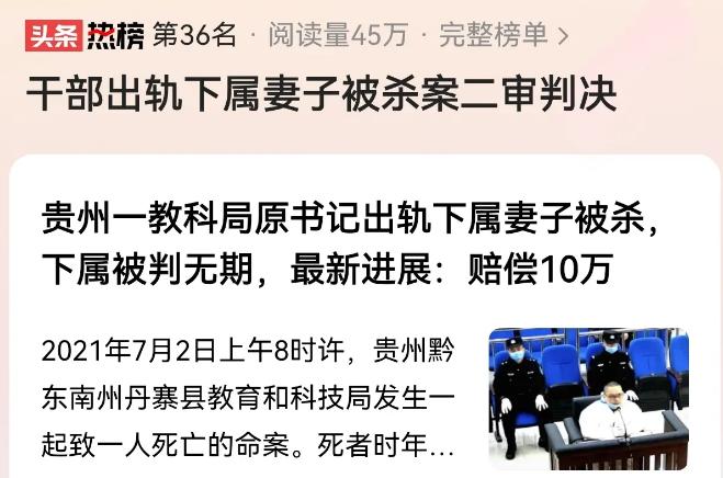 “这就是出轨的代价!”贵州,妻子深夜不回家,丈夫揣着刀在楼下等,只见一辆轿车缓缓驶来女人花枝招展的从车内钻出,在丈夫的再三逼问下,老婆承认和自己的领导勾搭上了,而且还多次滚床单,男人一怒之下提刀前去报复,冲突中,领导被捅伤肚子失血过多而亡,其家属要求男人赔偿124万!结果法院竟这么判了。 (信息来源:大皖新闻 贵州一教科局原书记出轨下属妻子被杀,下属被判无期,最新进展:赔偿10万) 陈旭东现年30岁,在贵州某县教育和科技局任职,本该前途一片光明,但近日却眉不展。 只因为妻子返家的时间越来越晚了,而且还时常一身清凉出门,喝的醉醺醺回来。 这天凌晨一点钟,男人心里突然烧起一股无名火,他确信女人背着自己在外面找相好的了。 于是揣着一把折叠刀来到单元楼门下,准备现场捉奸。 不久,一辆轿车缓缓驶入院子,停下后,里面传来男女亲密的对话声。 车门打开的瞬间,陈旭东愣住了,后座的男子居然是自己的顶头上司罗书记。 当天,他压抑怒火再三审问老婆,没成想女人却大言不惭的表示自己早就和罗某发生了关系,而且正处于热恋期间。 听闻此话,陈旭东悔的肠子都青了。 原来2020年7月,单位组织帮扶工作,妻子便在活动中和罗书记认识了,事后还互相加了联系方式,隔三差五的闲聊。 起初,陈旭东还为此沾沾自喜,想着有朝一日能搭上顶头上司的顺风车升个一官半职。 再加上罗某本人事业有成,家里老婆孩子听话孝顺,所以压根没往坏处想。 结果...竟生生给带了个绿帽子! 当晚,因为气不过陈旭东狠狠把妻子给揍了一顿,事后女人被送往医院,望着支离破碎的家,他的心里燃起了一股复仇的火焰。 2021年7月2日傍晚7点,陈旭东头戴帽子,身穿迷彩服在黑夜的掩盖下,悄悄来到了单位。 他的衣服里藏着一把锋利的折叠刀,还有两把屠宰用的快刀,进入办公室后,罗某不巧出去了。 于是便折返来到书记家楼下伺机埋伏,结果一个小时过去了,还是不见对方的影子。 晚上8点半,他又偷偷返回了办公室,只见罗某正悠闲的躺在201办公室的椅子上。 彼时的他还没意识到死神已经来到了。 下一秒,陈旭东举着刀就冲了过来,因为没有防备,一刀正中罗某的肚子,男人痛苦的跑出房间一头栽倒在楼梯间,失去呼吸。 事后,法医鉴定,罗某死于锐器刺破心脏导致的大出血。 而陈旭东作为凶手,也被赶来的警方当即逮捕。 2022年1月12日,这起轰动全网的奸情命案终于迎来了最终审判,陈旭东因故意杀人罪被判处无期徒刑。 对此,死者家属提出了124万人民币的索赔,包括丧葬费、精神损失费等。 然而考虑到事发前,死者和凶手的老婆关系不清不楚,最终导致了这起命案,法官将124万赔偿金改为了人民币10万元。 被告当即表示不服,提起上诉,二审时,法庭维持原判。 最终,陈旭东无异成了本案最大的受害者,不仅被戴了绿帽子,工作没了,到头来还要赔偿对方10万块。 当然了,罗某的教训也是极为惨重的,大好的仕途葬送,小命也没保住。 对此,你怎么看,欢迎在评论区留言、讨论。 (文中人物为化名)