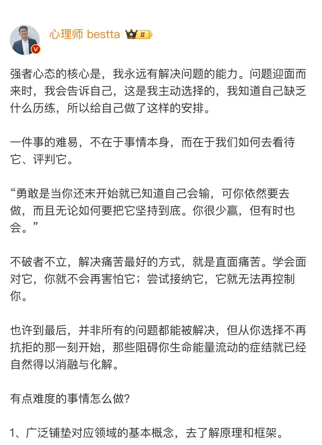 不破不立,解决痛苦最好的方式,就是直面痛苦。学会面对它,你就不会害怕它;尝试接纳它,它就无法控制你。说的太棒啦,这个建议很中肯。谢谢