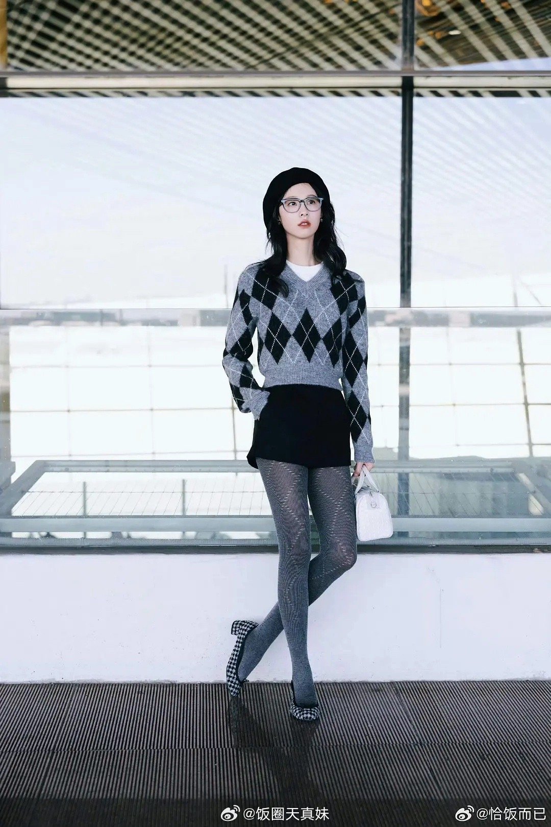 菱形格纹针织配黑白格鞋已经够花哨了,还加了一个灰色菱形镂空针织袜,陈都灵穿这身去
