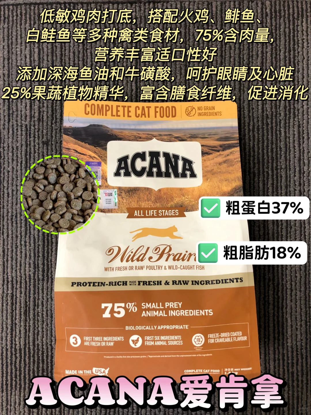 这款猫粮一提起来就会想到渴望,爱肯拿和渴望同厂,但创立时间早于渴望,口碑挺不错的!爱肯拿配方和渴望比较相近,鸡肉为主,无谷配方,对猫咪来说,比较容易吸收,减少肠胃负担!里面还添加了鱼油,对美毛有一定帮助,适口性也不错,有膳食纤维,促进肠胃蠕动,帮助消化~适口性不错,颗粒不油,酥脆干爽!