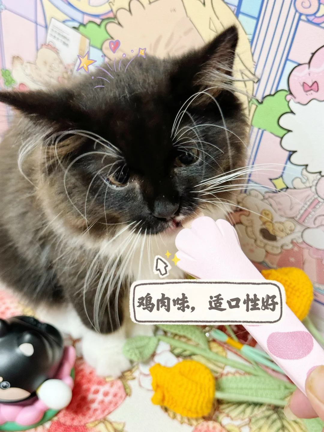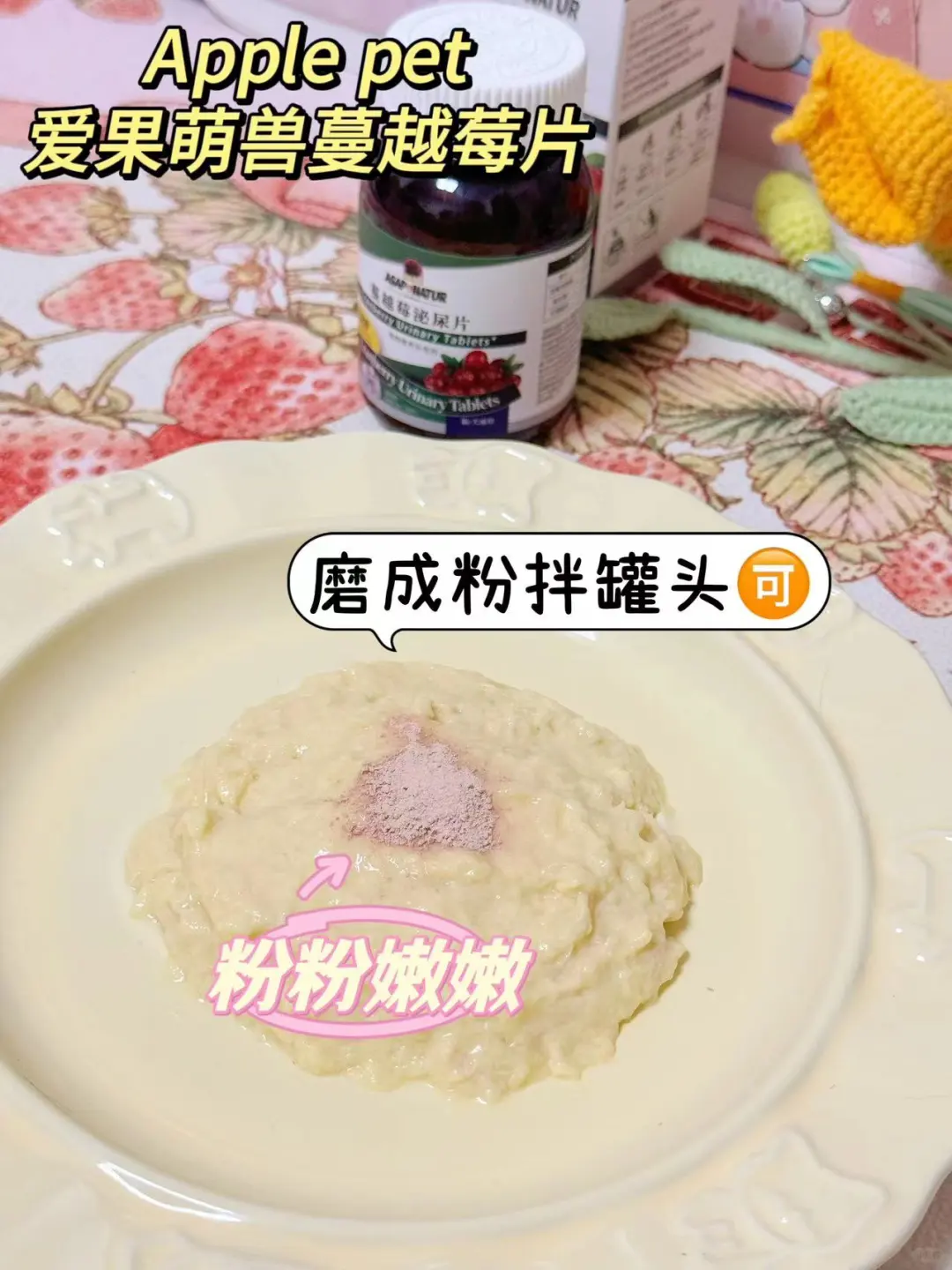 粉嘟嘟的片剂,磨成粉以后粉粉嫩嫩的,加了鸡肉粉像吃鸡肉味的冻干一样,泡芙葡萄都kuku炫,一点都不排斥👏