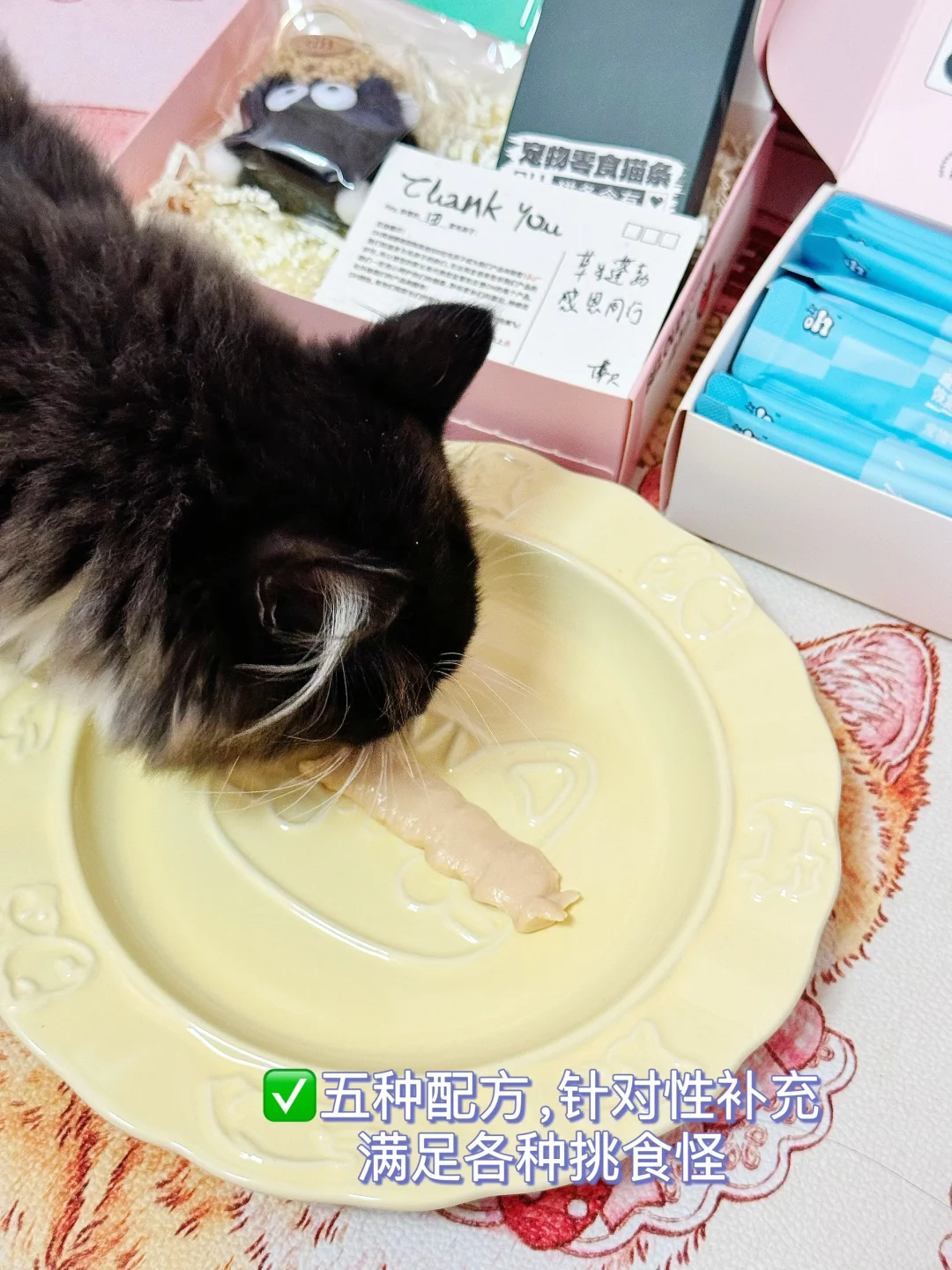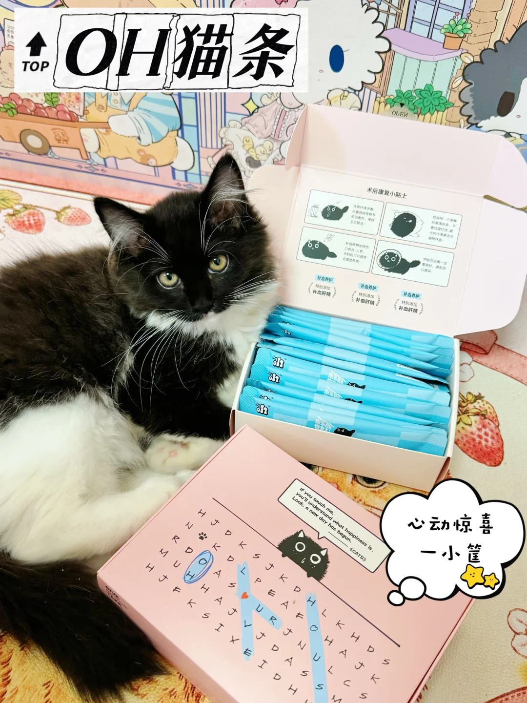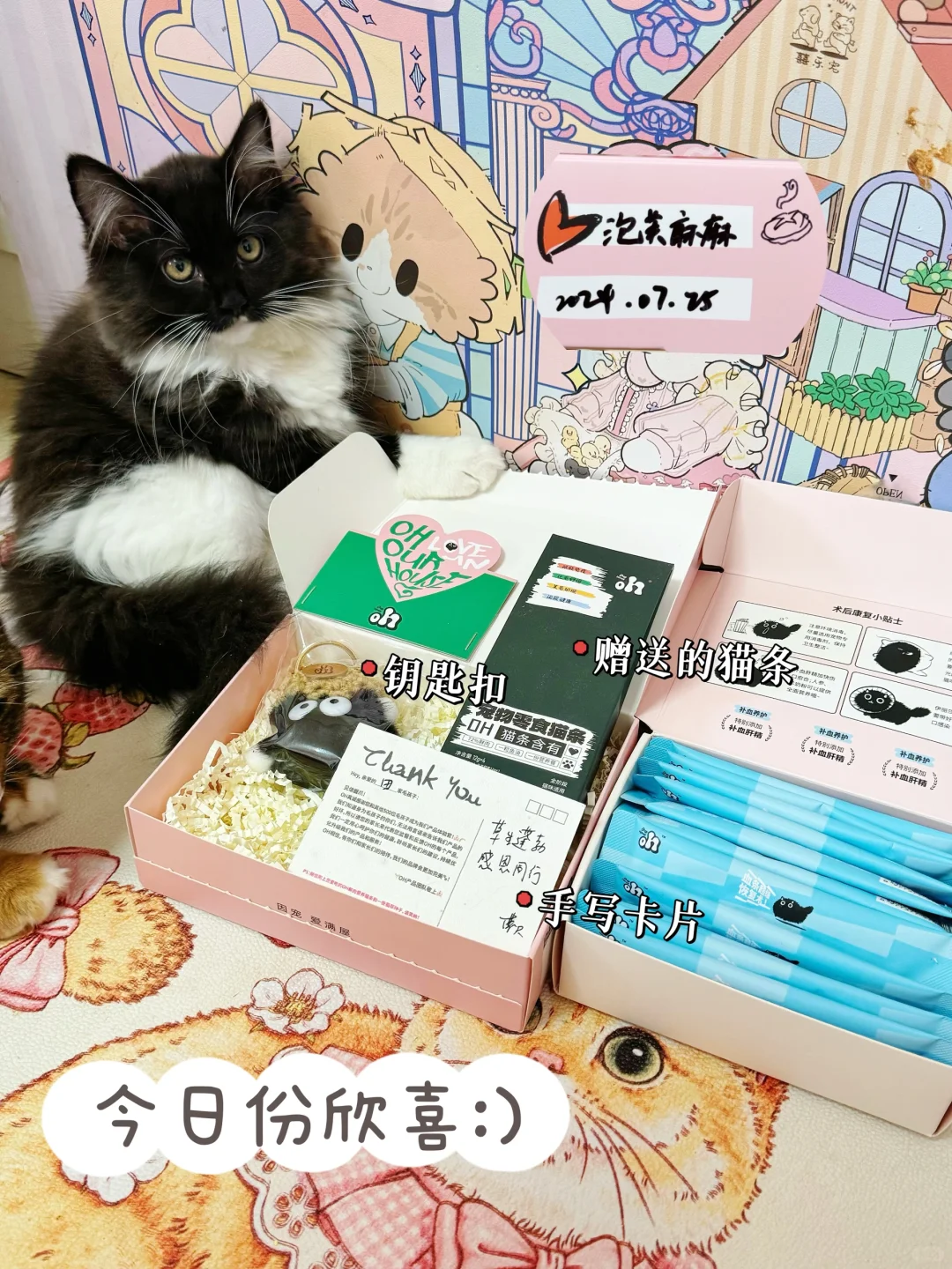 [萌萌哒R]买个猫条真的被重视到了! 随单送了一个礼盒,不仅有OH品牌形象的钥匙扣还送了猫条[哇R]蕞蕞让我惊喜的是盒子外面有手绘还有一张手写的卡片,虽然寥寥几笔,但也是真的用心了! 👉再来说说产品,虽然说是零食猫条,但是鲜肉投入那是真不含糊✅72%的占比是多少号称主食猫条都难以企及的🫡还添加了乳铁蛋白、南极磷虾油和人参,营养价值嘎嘎高[偷笑R]5种配方针对5个方面定点解决问题,适口性毫无压力,葡萄kuku炫,拉都拉不住! [暗中观察R]要我说,国产品牌就应该向OH看,用心做产品,用爱养毛孩~