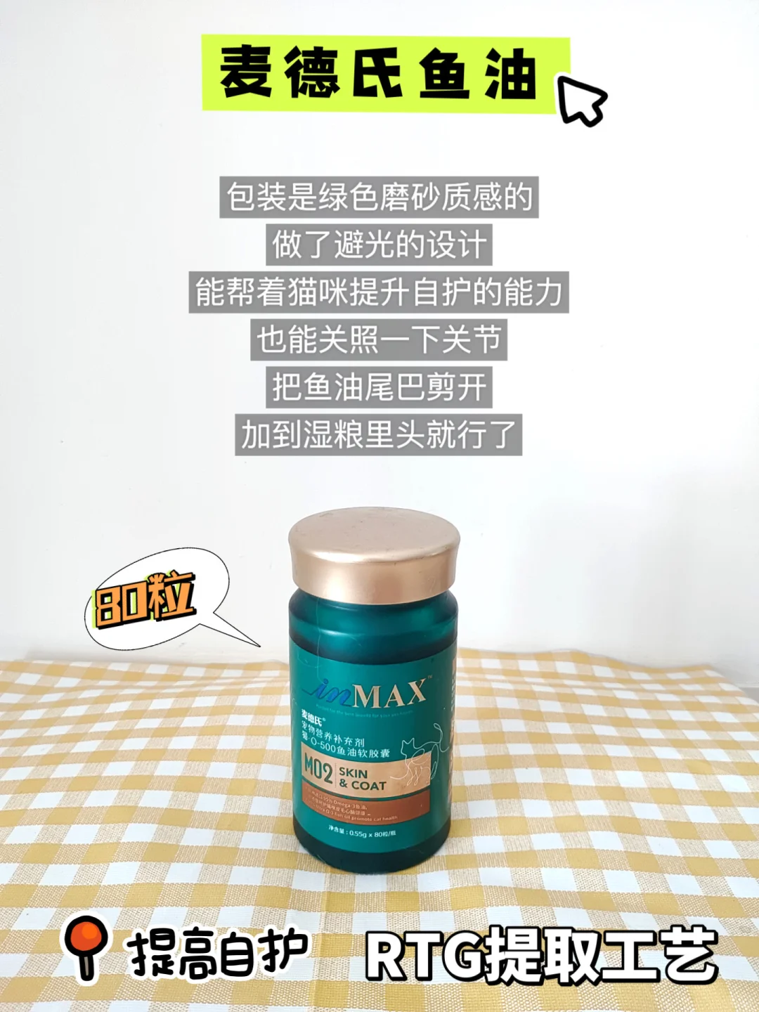 包装是那种绿色磨砂质感的,做了避光的设计。能帮猫咪提升自我保护的能力,对关节也有好处。把鱼油的尾巴剪开,加到湿粮里就可以啦。