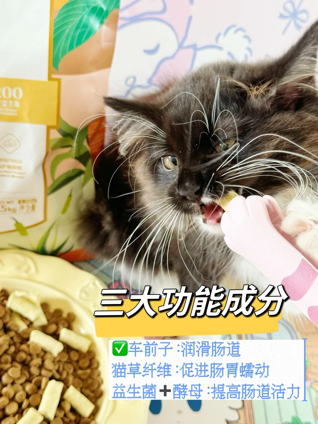 ✅它添加了三大功能成分:猫草纤维、车前子、益生菌和酵母,能提高肠胃活力 润滑肠道 促进蠕动,从而帮助猫咪排出毛发,温和不刺激👍