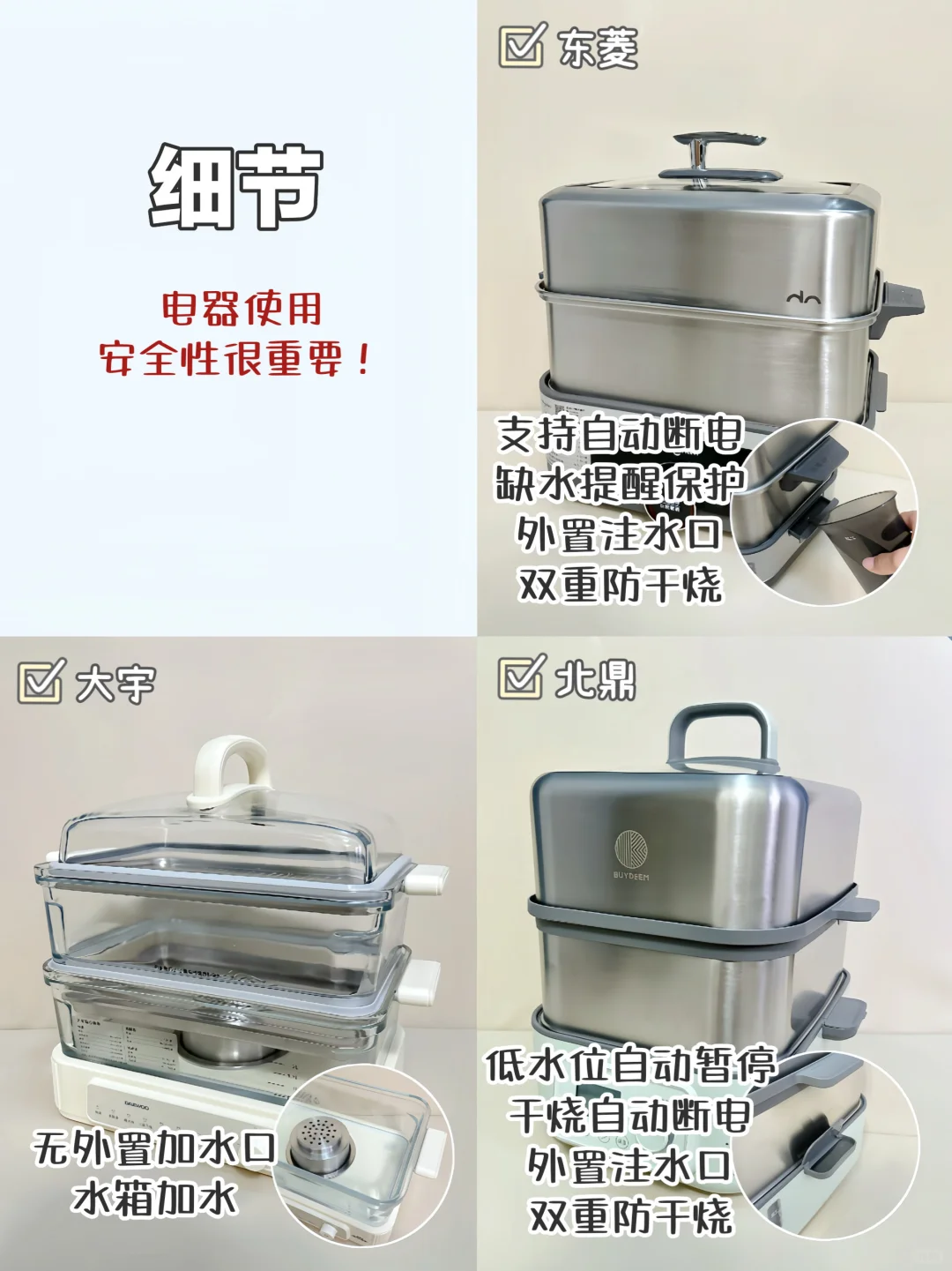 北鼎:低水位自动暂停,干烧自动断电;外置注水口,双重防干烧