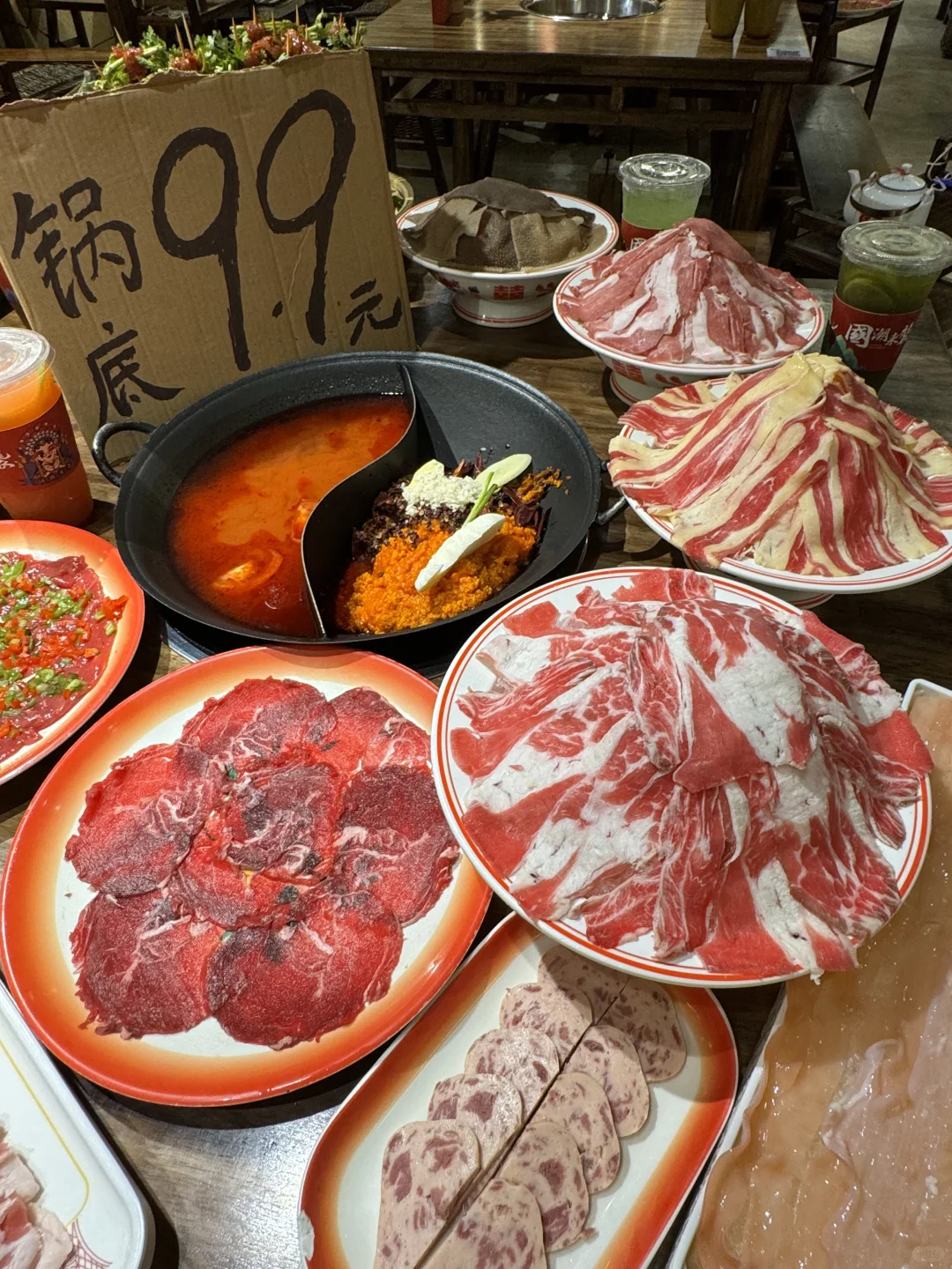 菜品单价都很便宜,人均五六十就能吃很好。 而且大学生锅底还只要9.9r!!真的太便宜了,快带上学生证去吃吧!!