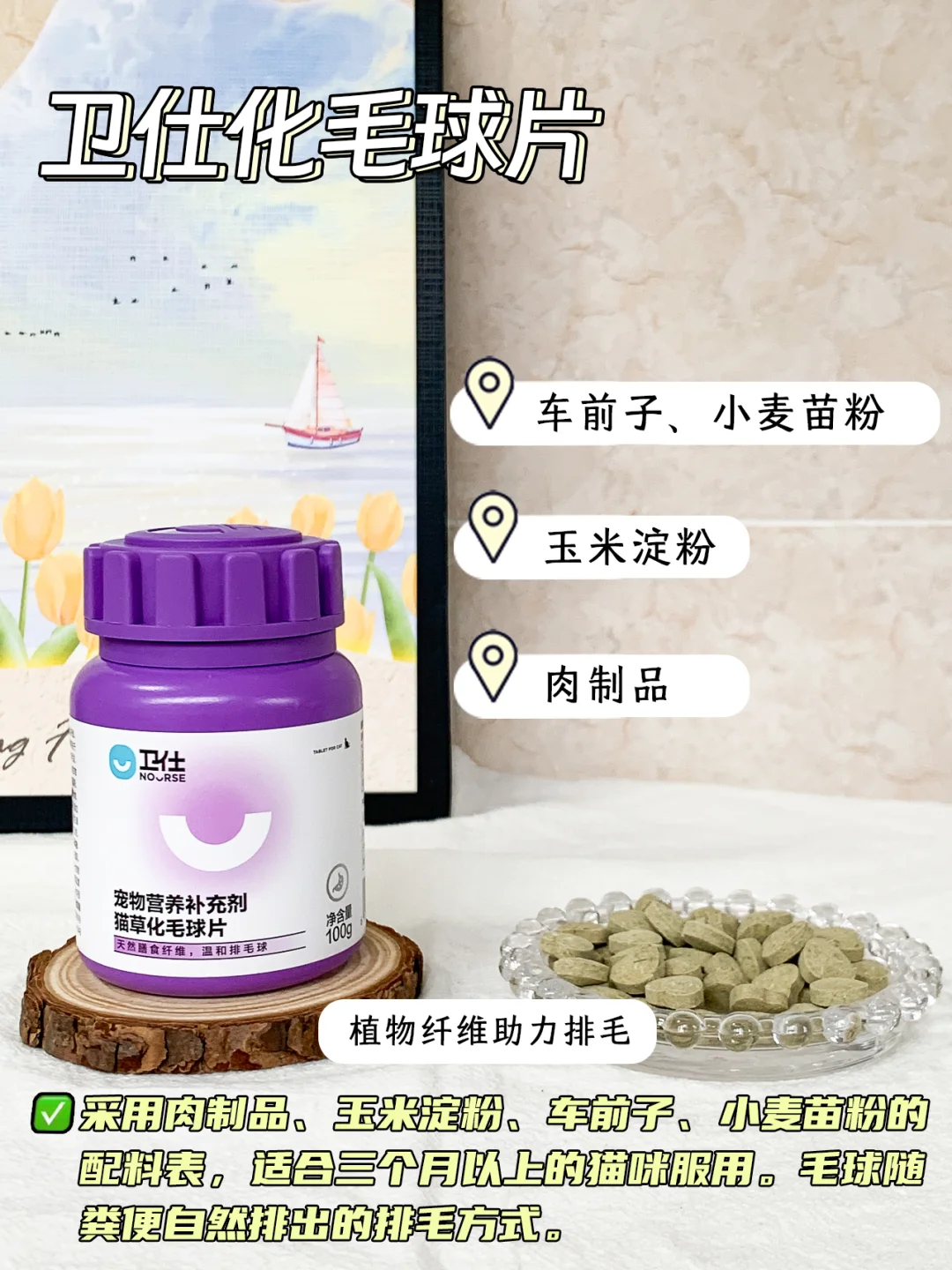 采用肉制品、玉米淀粉、车前子、小麦苗粉的配料表,适合三个月以上的猫咪服用。毛球随粪便自然排出的排毛方式。