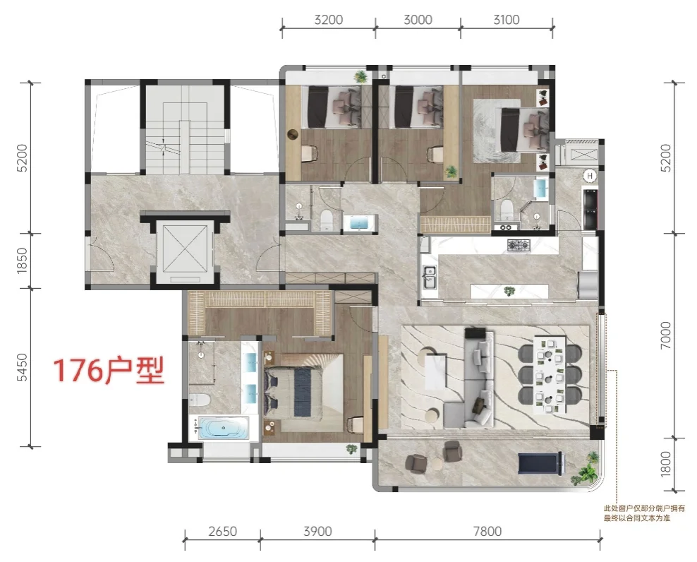 176㎡户型: 一体化IMAX设计、7.8米大尺度横厅、端户配置270°观景仓、星级酒店式双套房