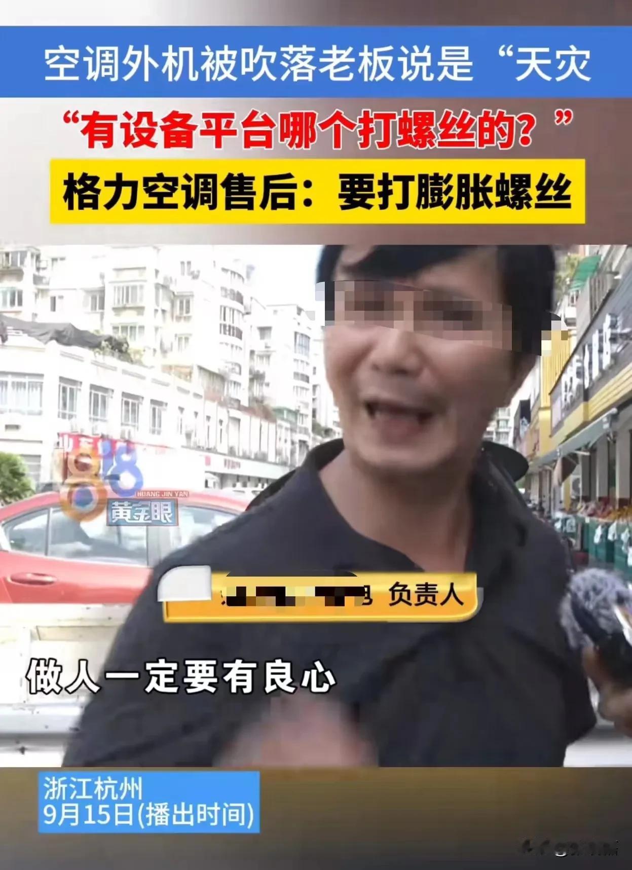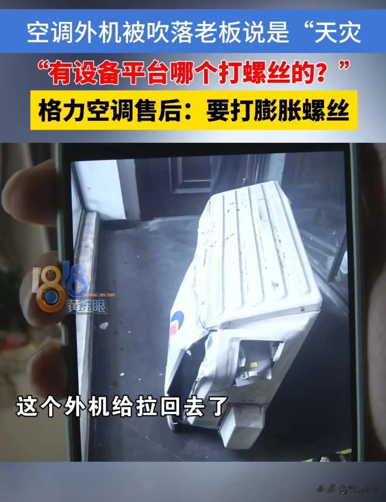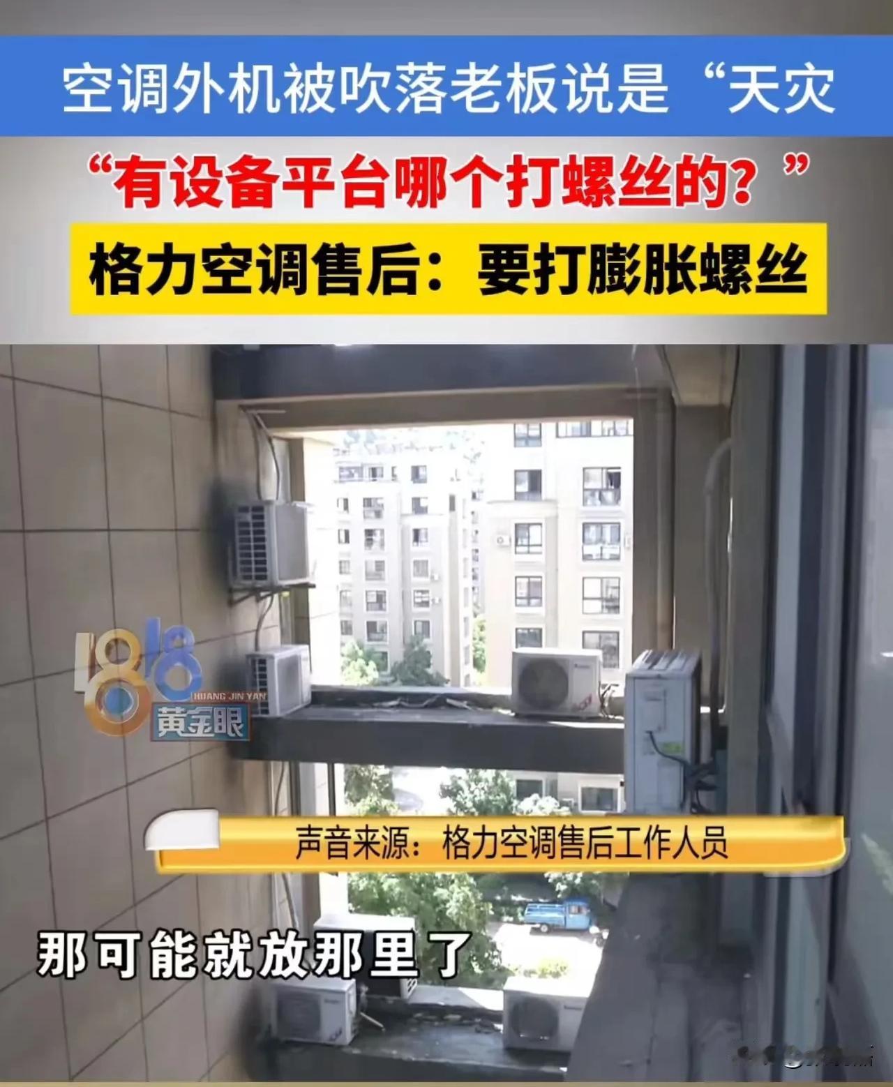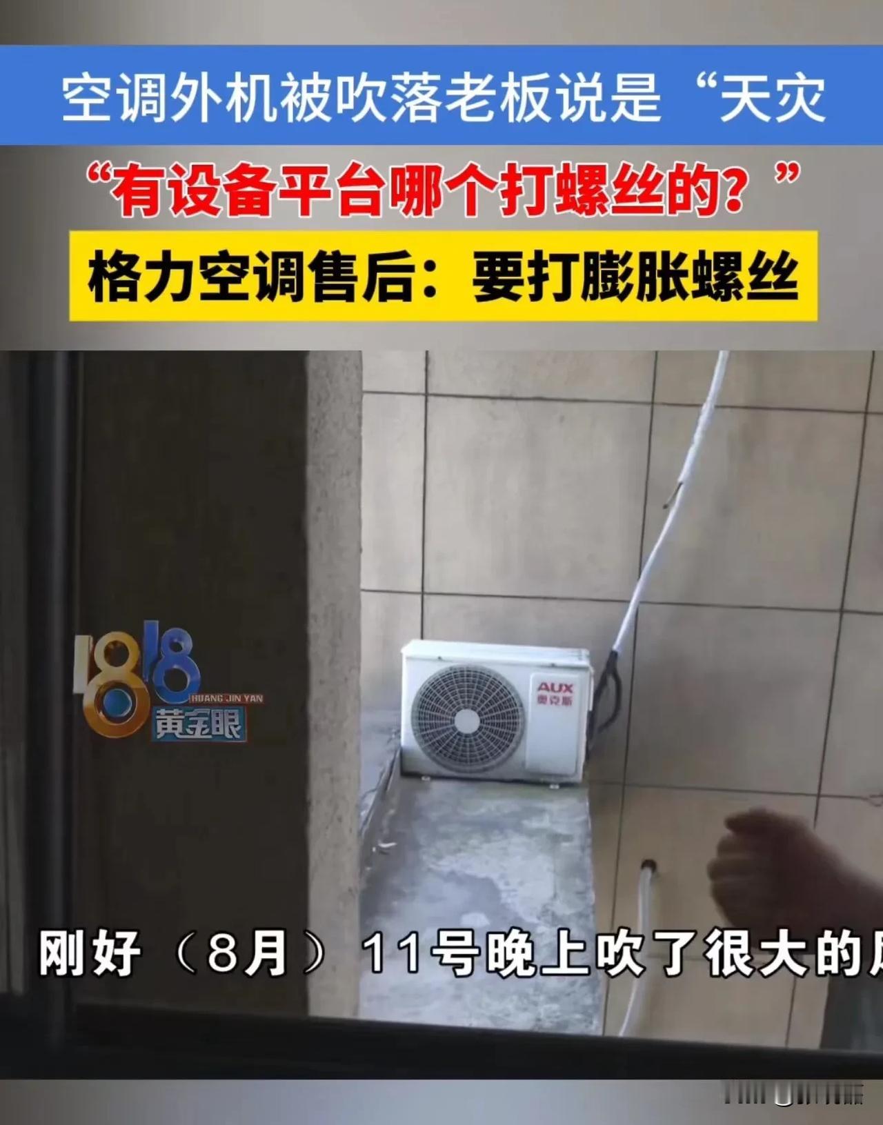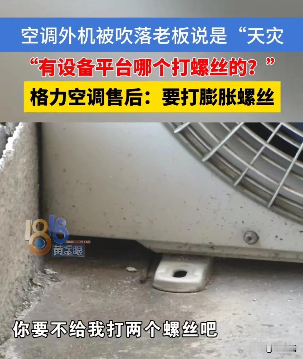 浙江杭州,空调外机没打膨胀螺丝被风吹落,男子要求赔偿,可老板却说:“你能不能讲点良心!这是天灾,有设备平台哪个打螺丝的?”网友:老板口口声声说讲良心,你安装没打螺丝,明知道有安全隐患,岀事了你还不知道自己错在哪里。以后谁敢跟你买设备? (来源:1818 黄金眼) 五年前,张先生买了一台格力空调花了近一万元,空调是经销商派人上门安装的! 上个月刮大风,空调外机被风吹到楼下摔坏,幸好没有遭到人! 而张先生联系了卖他空调的老板,老板把空调外机拉回去修,但迟迟没有修好! 张先生认为这是老板派的人安装不当,应该要对他赔偿,于是找调解员帮忙。 张先生给调解员看了邻居家的外机,发现他们都是竖向安装,这样吃力面较小,风是吹不下去的! 而他的外机是横向放置,且没有打一颗螺丝。他安装的时候跟安装工说过打螺丝,但安装工偷懒,说这么重的机子是不会掉下去,就没打。 调解员又找到卖空调的老板,老板说:“这是天灾,哪个地方是有设备平台打螺丝的?如果没有特殊原因是不会掉的。什么地方都不打,因为这个打下去要渗水的!“ “那机器能不能修好?”调解员问。 老板说:“机器摔成这样,能修好吗?做人呢一定要有良心,这个事不是我的事情,我把他把他揽过来,自己来给他搞了,还要怎么样?” 那么,空调外机到底要不要打螺丝呢?调解员联系了格力空调售后。 工作人员表示:外机需要打膨胀螺丝。不过这个也要看情况,比如说用户要求说这个地方有防水层的,不能打,那可能就放那了!一般我们正常的话,所有师傅出去安装,这底下必须要打膨胀螺丝! 此事引发了热议,有网友说,我是空调安装工,正常都会打,除了一些很特殊的平台,比如飘窗下面有百叶箱那种,放在百叶箱里面一般不打,或者是箱子形状的平台也不用,像视频里面这种必须打,偷懒的话打一个也行 也有网友说,老板不要哇哇叫,还好是没砸到人,伤人就是另一个故事了! 还有网友说,我的天!这种高空地方什么师傅啊心这么大,敢不打螺丝?掉下去砸到人就不是赔空调这么简单了,再怎么样也要对角打两颗螺丝啊! 而我想说的是,同样是“天灾”,对面那个外机稳如老狗,这难道不讽刺吗?而且张先生当初还强调要打螺丝,工人偷懒还嘴硬…… 只是摔坏了机器,还算万幸了!砸到人咋办。谁的责任?不觉得害怕吗? 不下固定螺丝绝对你的问题,哪怕顾客说不用也是你的问题,因为你专业的。如果是别的原因不能打螺丝,那你就应该用支架安装在墙上! 什么是天灾人祸,是不可抗拒的因素,属于天灾人祸 ,有预防措施的时候,再出问题,那是天灾。 老板说没有特殊原因不会掉下去,那要是有特殊原因(除了人为)导致它掉下去了,那你这个老板和你们公司的安装部门会不会负责? 你还会不会找其它理由? 那么,你对此事怎么看呢?