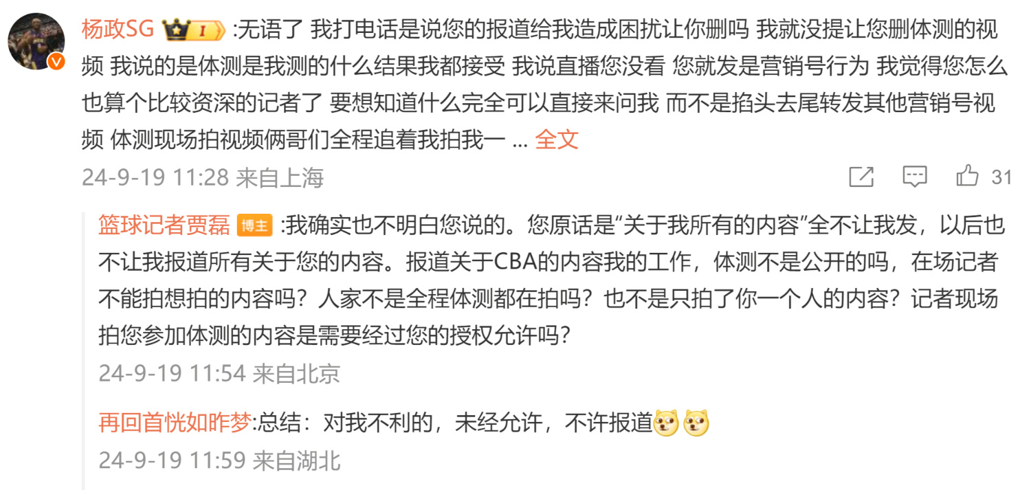 新一轮的口水战来了,但这波风暴的核心依旧围绕着杨政这名“网红球员”展开。根源就是他与篮球记者贾磊的一波通话,根据贾磊的说法,杨政专门来电希望他删除直播视频与关于他的CBA体测报道。但两人的口水大战也就此展开!杨政在自己的微博上宣传,贾磊的报道给他造成了困扰,但他没有提让其删除相关信息。 得!这波争议就此展开,甚至还有网友发出这样的声音,是爷们就把体测过了。毕竟矣进宏这名31岁的老将都做到了这一点,杨政没有理由会不行。如果他的体测能够像矣进宏一样顺利通过,也不会发生他与贾磊相互自证清白的这件事了。毕竟谣言止于智者,兴于愚者,起于谋者,这件事杨政还真的需要处理好。