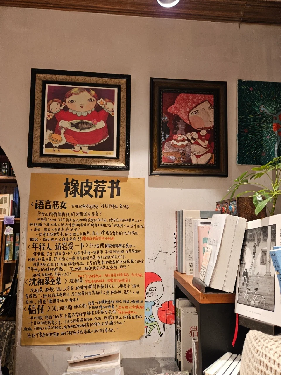 书店才是重头戏,书多得让人眼花缭乱,但摆放得整整齐齐,找书特别方便。店内还很贴心地贴着橡皮荐书,都挺有代表性的,我挑了一些打算回去慢慢看。