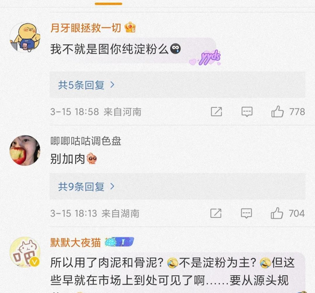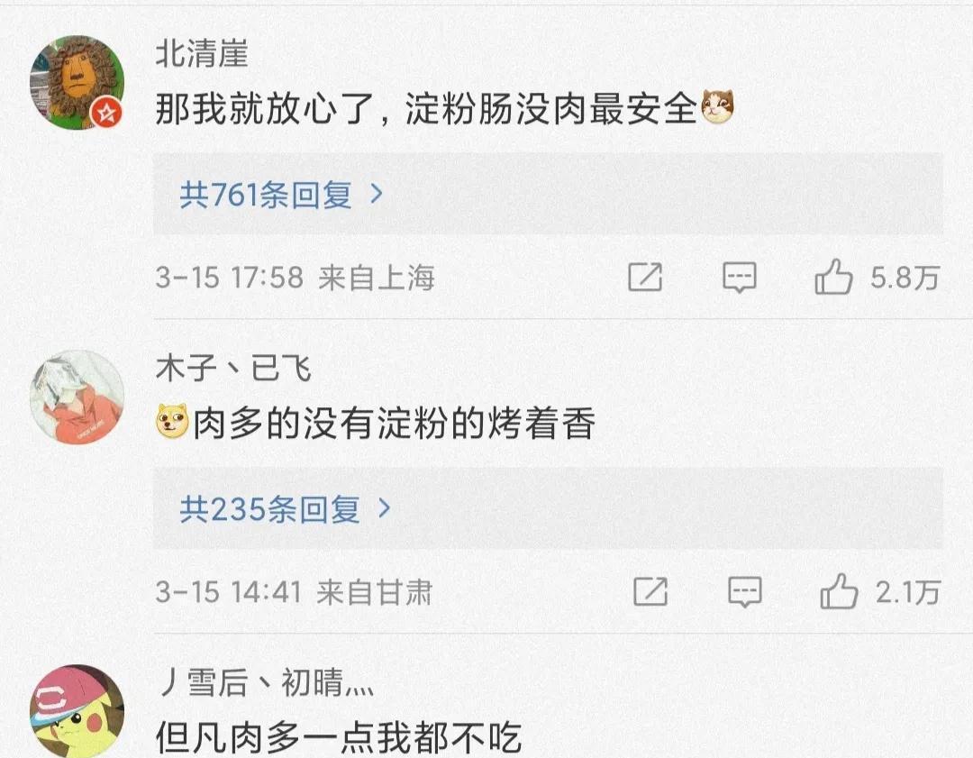 315消费者权益日,淀粉肠上了热搜! 每年的3月15日,对于广大消费者而言,都是一个特别的日子——消费者权益日。这一天,各种消费问题、假冒伪劣产品都会被推到风口浪尖,成为公众关注的焦点。而今年,一个看似不起眼的食品——淀粉肠,竟然意外走红,成为了热搜榜上的热门话题。这不禁让人好奇,这小小的淀粉肠背后,究竟隐藏着怎样的故事呢? 在我们的日常生活中,淀粉肠似乎总是扮演着那么一个不起眼的角色。它价格便宜,口感鲜美,无论是作为早餐的配菜,还是下午茶的零食,都深受人们的喜爱。然而,就是这样一个看似普通的食品,却在今年的315消费者权益日,被推向了舆论的风口浪尖。 原来,最近有一则报道揭示了淀粉肠背后的真相:原来,我们平时吃的淀粉肠里,除了大量的淀粉之外,竟然还添加了鸡肉和鸡骨泥。这一消息一出,立刻引发了网友们的热议。有人惊呼:“这还是我们熟悉的淀粉肠吗?”有人则表示:“以后吃淀粉肠可得小心了!” “民以食为天,食以安为先。”这句老话道出了食品安全对于我们的重要性。在快节奏的现代生活中,方便快捷成为了许多人选择食物的首要标准。而淀粉肠正是这样一种符合这一标准的食品。然而,当我们享受着它带来的美味与便捷时,是否也忽略了它背后的食品安全问题呢? 事实上,食品安全问题一直是我们生活中不可忽视的一部分。从地沟油到毒奶粉,从过期食品到假冒伪劣产品,每一次食品安全事件的发生,都牵动着亿万消费者的心。而淀粉肠中的“鸡肉和鸡骨泥”事件,无疑再次给我们敲响了警钟:在追求美味与便捷的同时,我们更不能忽视食品的安全与健康。
