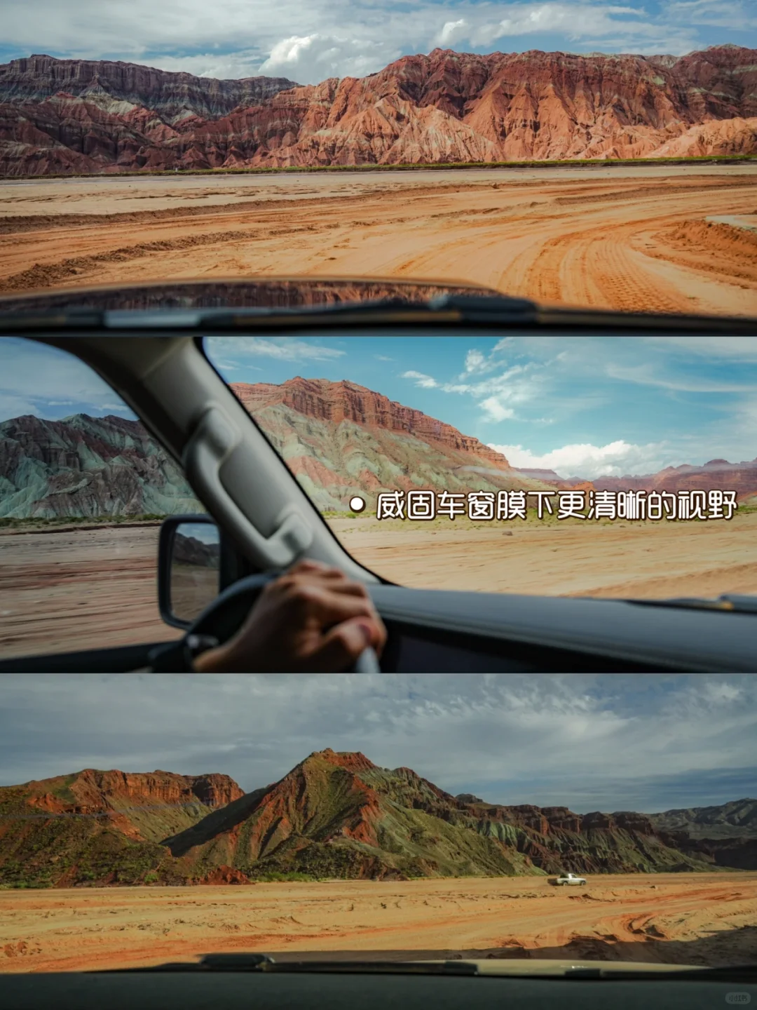 整个行程在车内直面阳光的时间也不少,所以朋友还选择了威固的旗舰型车窗膜VP70,也是优秀buff叠满,在南疆如此干燥和暴晒的环境下,真切感受到了隔热和防晒效果,简直就是我这类敏感肌人群的救星!这款窗膜在安全防护方面也很到位,当玻璃发生破碎时,能有效粘住碎玻璃,防止窗户破裂后飞溅。在落石、泥石流等恶劣环境频发的行程中,真的有必要提前预防