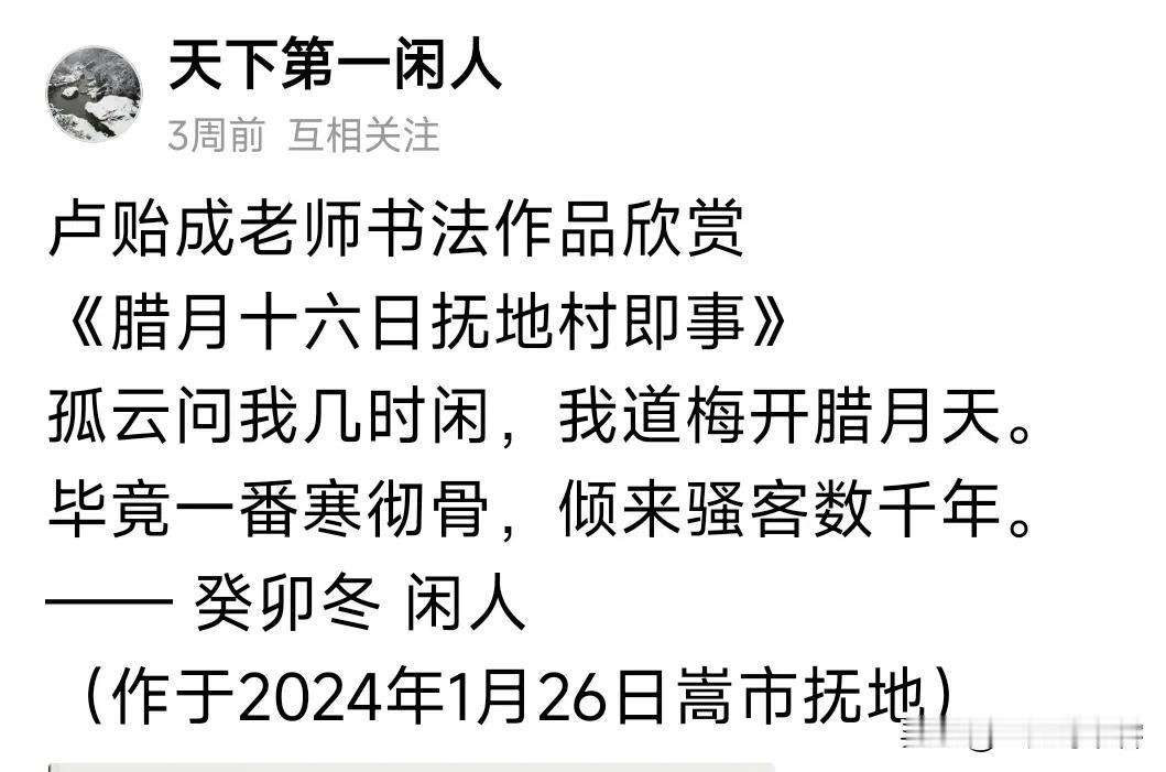 #凡间诗话# 七律|赠好友@天下第一闲人 步韵和@琴川客 天下清闲第一人,粗缯大布揽风尘。 看他玉垒云中散,笑我珠光沙里堙。 梦想田园能饱腹,朦胧诗酒自安贫。 无时意气冲牛斗,仗义争先不惜身。 (上平十一真)20240922