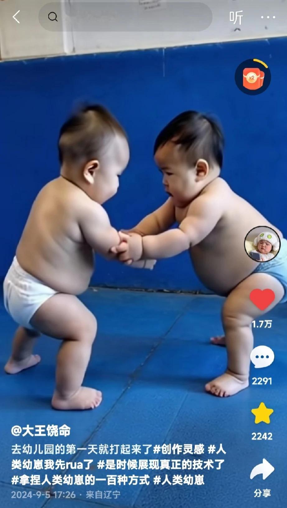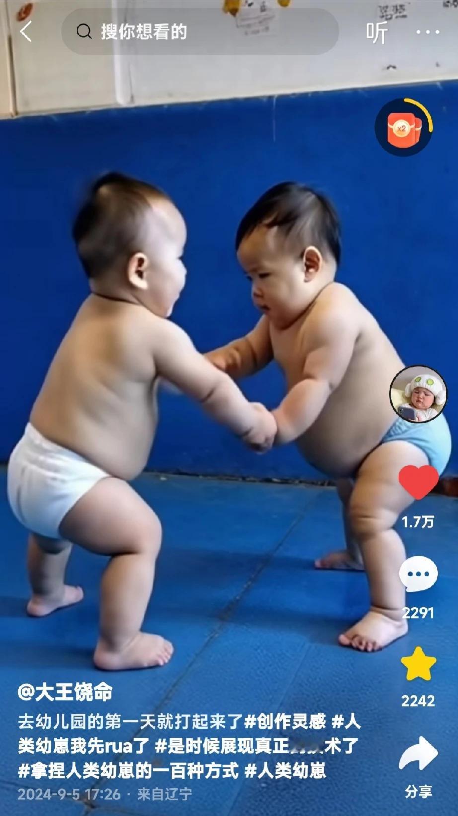 刚才那俩双胞胎是在妈妈的肚子里内卷[捂脸],这俩小家伙儿则把战场搬到了幼儿园——他们的妈妈说到幼儿园的第一天就打起来了[呲牙][捂脸][捂脸][捂脸] 还有模有样的,我看着像微型版的日本相扑,两个尿不湿看着也很像丁字裤嘛,那是日本相扑的标配……[捂脸]