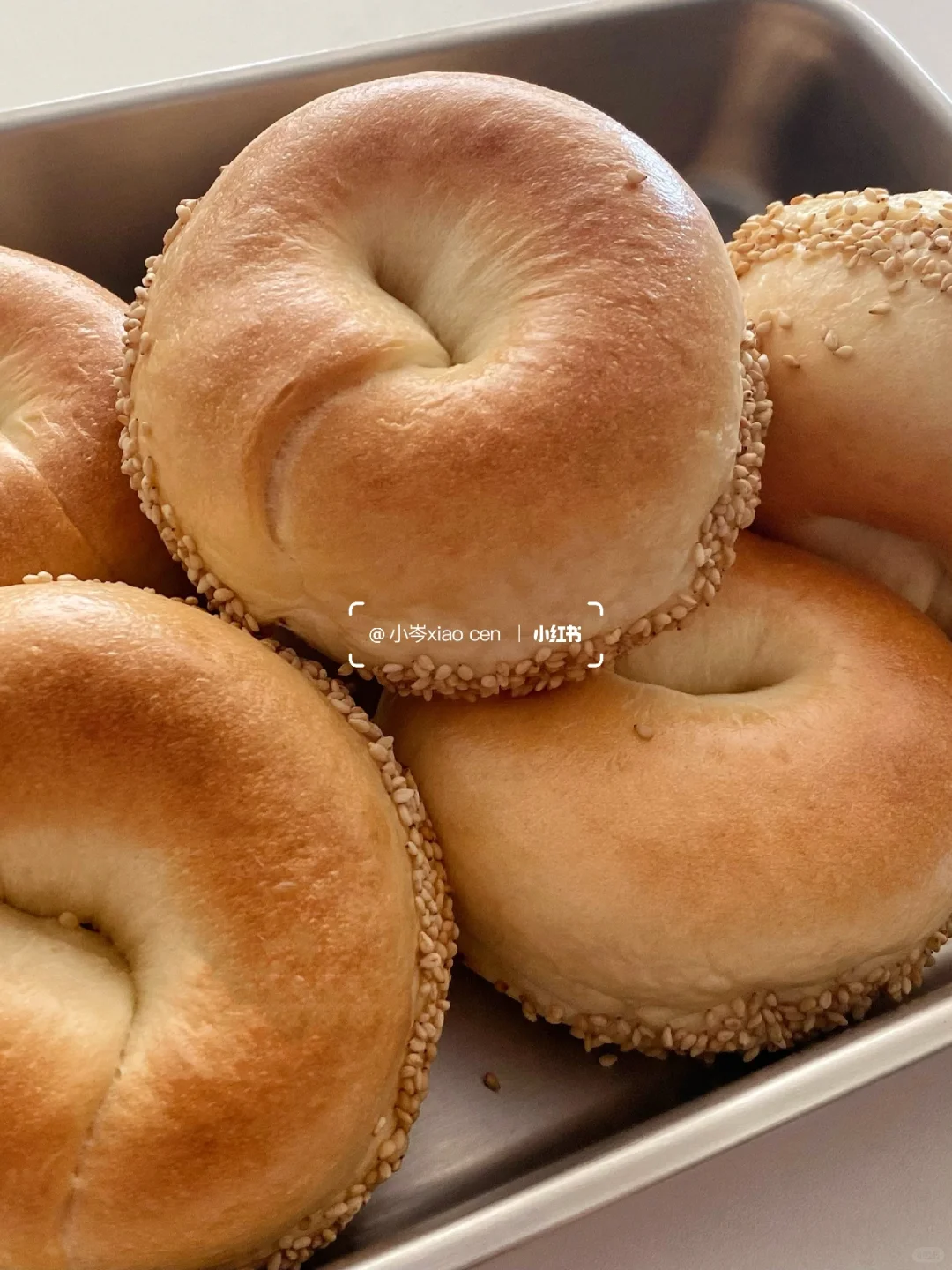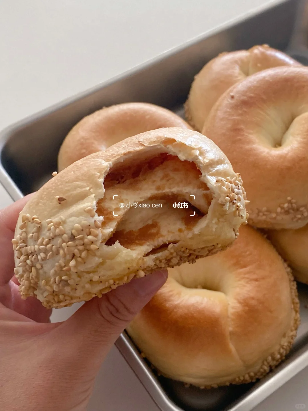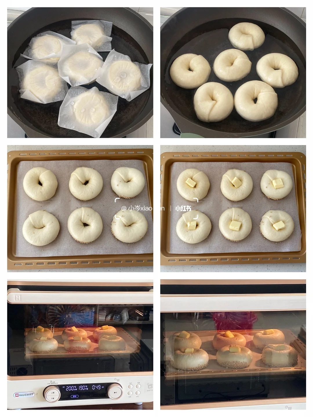 8.面团底部沾白芝麻,依次摆放在烤盘上,面团中间放一小块咸味黄油;