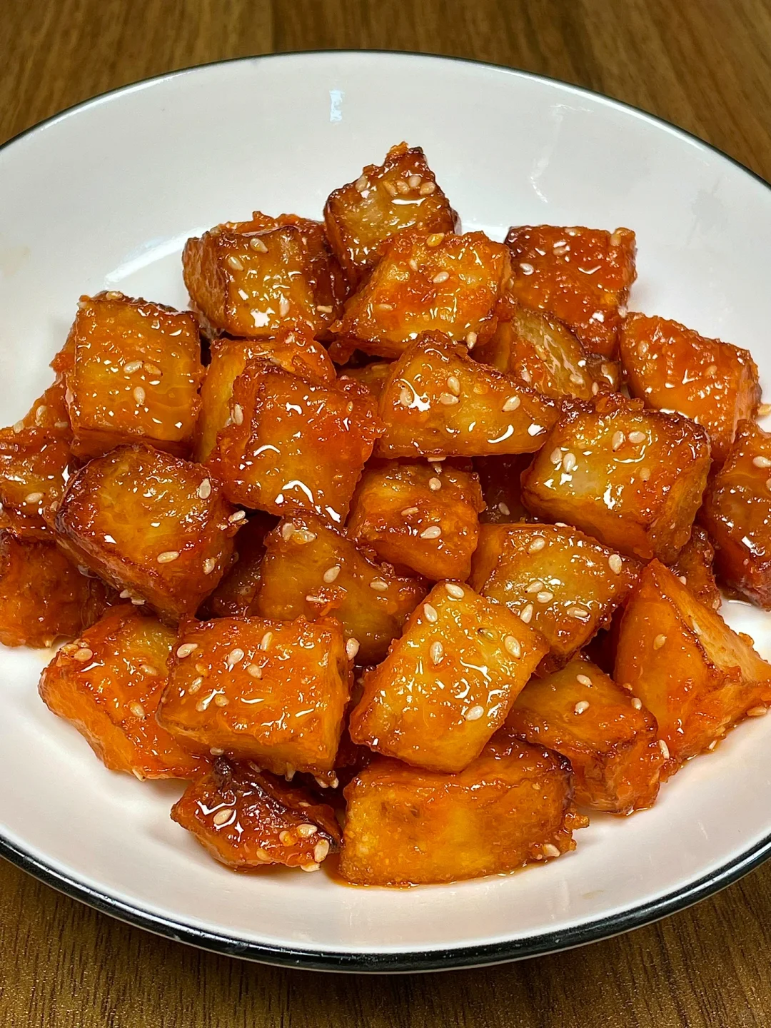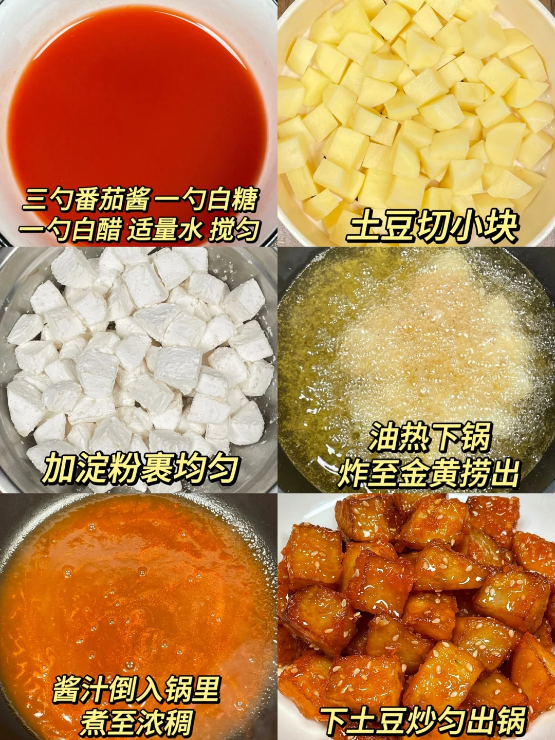 去朋友家吃了这道糖醋土豆,回家想了好几天[哭惹R]今天安排上!!酸甜浓郁的酱汁,裹满外酥里糯的土豆,好吃到炫不停!!一口一个嘎嘎香[黄金薯R]大人小孩都爱吃,一定要去试试!! [向右R]食材:土豆 [向右R]做法:如图所示!
