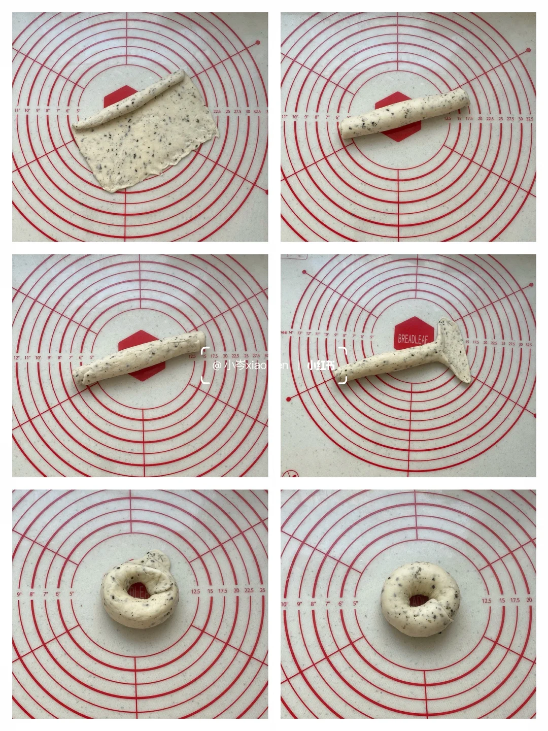 2.分成6份,滚圆后盖上保鲜膜20分钟,取一个面团擀成长橄榄形,翻面,卷起来,捏紧收口,搓长一些,长度约22厘米;