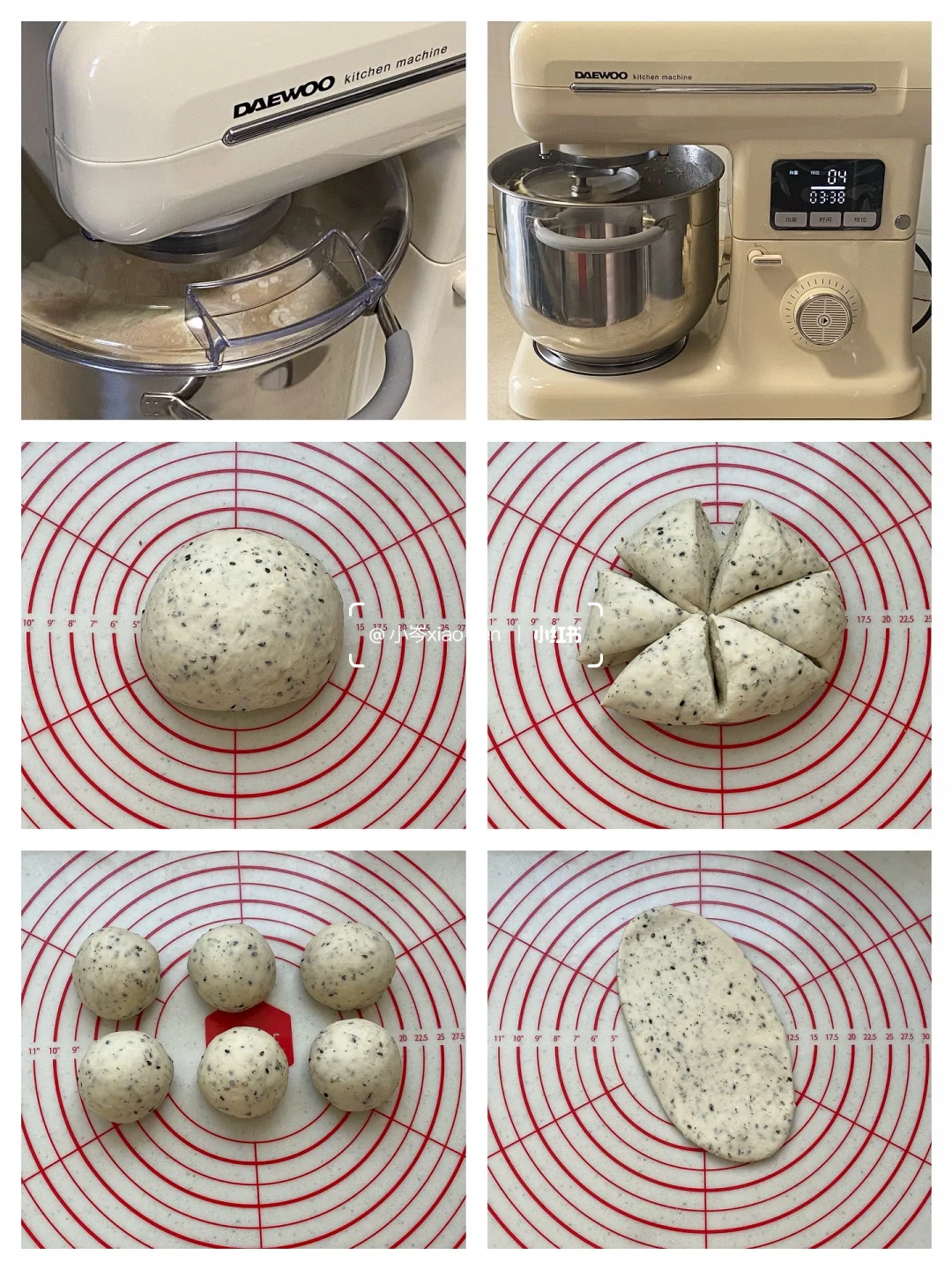 1.将面团材料放入厨师机揉面桶内混合,揉成光滑的面团。