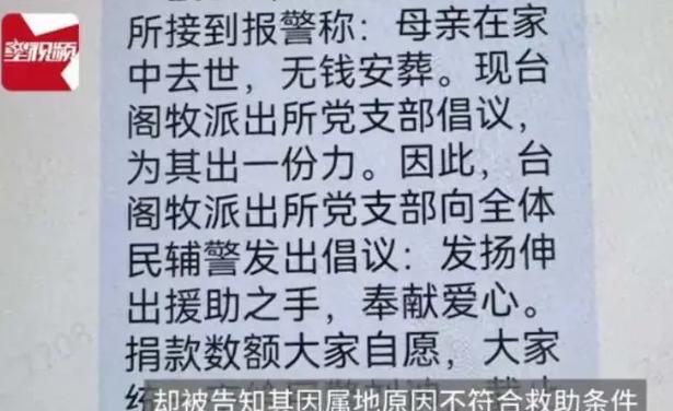 “这个派出所火了!”内蒙古呼和浩特,母亲在家中去世,小伙无钱安葬,无奈报警求助!小伙:“家里存款只有 1000 元,能不能帮我安葬母亲!”而接下来派出所民警的做法,让小伙哽咽流泪。 在小张的心中,写给民警的感谢信是一份沉甸甸的承诺和感激,他的手指在纸面上游走,字迹虽不算工整,却饱含着难以言表的情感。 每一个字都像是倾注了他的心血,那是对温暖的回馈,是对陌生人施以援手的深深敬意,感谢信中,小张写道,他曾感到无助和绝望,正是民警的出现,照亮了他最黑暗的时刻。 每当他回忆起那个寒冷的夜晚,心中都涌起一股暖流,犹如一缕阳光穿透了他失去亲人的阴霾,重新燃起了生活的希望。 小张的母亲安葬仪式在民警和村委会的帮助下顺利进行,他们将小张母亲的遗体送往火葬场,所有的准备工作都在细致而又温暖的气氛中完成。 村里的人们自发聚集在一起,默默地为小张和他的母亲送上祝福,小张在这个充满敬意和爱的时刻,深切感受到村里的团结与温暖。 尽管失去至亲的痛苦依然萦绕在心头,但这种来自周围人的关怀,让他倍感欣慰与感动,母亲的遗体被安放在一个洁白的灵堂中。 周围鲜花环绕,温暖的烛光照亮了整个空间,映衬出每个人脸上的神情,小张紧握着母亲的遗物,感受到无比的安宁与释然。 回想起这一切,爱心如涓涓细流般汇聚而来,民警和村委会的自发募捐活动,让小张感受到人间的温暖。 派出所的工作人员和村民们积极参与,大家纷纷慷慨解囊,捐出了自己的一部分微薄收入,这个小镇上,每个人都为这个年轻人提供了一份力所能及的帮助。 无论是几元、几十元,所有的善款都如涓滴汇聚成河,最终为小张解燃眉之急,这一刻,小张看到了希望,看到了人间的真情。 虽然身边的物质条件有限,但人们的爱心和温暖如同一座无形的桥梁,将他与这个社会紧紧相连。 然而,这段救助之旅并非一帆风顺,在联系相关部门时,民警遭遇了一次又一次的挫折和困境,尽管他们尽心尽力,却被告知小张并不符合救助条件,原因是“属地不符”。 这令民警感到无奈与挫败,救助的请求一次次被推却,而小张的痛苦与焦虑却如潮水般不断涌来。 面对这样的窘境,民警没有选择放弃,他们通过各种渠道寻找解决方案,始终相信,只要努力,就一定能找到出路。 小张拨打报警电话的那一刻,仿佛是绝望的最后一根稻草,他的心如同狂风暴雨中摇摆的船只,随时都有可能被吞没。 夜幕降临,四周寂静得令人窒息,唯有小张颤抖的身影在微弱的灯光下显得格外孤独,失去至亲的痛苦交织着对未来的渺茫,让他无处诉说,唯有将心中无尽的苦楚化作电话那端的求助。 尽管心中充满了恐惧与无助,但他仍然选择相信,或许有人能为他点亮一盏明灯,照亮他前行的路。 小张的生活曾经是平静而安稳的,他和母亲相依为命,白天一起打工,晚上在简陋的屋子里共进简单的晚餐,那种日子虽不富裕,却让他感受到亲情的温暖和生活的希望。 然而,这样的日子在突如其来的病痛面前显得如此脆弱,母亲的重病如同暴风骤雨,彻底打乱了他们平静的生活。 小张努力想要为母亲寻找解决之法,但无奈的是,他的能力在这场命运的考验面前显得微不足道,眼睁睁看着曾经强健的母亲逐渐消逝,心如刀绞,却无力回天。 母亲的离世如同撕裂的伤口,痛苦难以愈合,小张在悔恨与自责中挣扎,无法承受这突如其来的打击,他想起母亲曾经对他的关爱,想起那些共同度过的点滴时光,心中满是怀念与悲伤。 失去至亲的感觉如同巨石压在胸口,让他几乎喘不过气来,面对这样的痛楚,他深知自己已无法回头,但他依然选择勇敢面对,将这份悲痛化作向前的动力。 而此时,家中仅剩的1000元存款,连基本的丧葬费用都无法支付,为了给母亲一个体面的安葬,他鼓起勇气,拨打了报警电话。 在这一切的背后,是人情的冷暖与社会的责任,小张的故事不仅仅是个体的悲剧,更是社会中诸多问题的缩影。 面对生活的脆弱与无常,社会应给予更多的关怀与支持,或许,正是这些关怀与支持,才让小张在失去母亲的黑暗中找到了一线光明。 每一个行动,都是对人性的呼唤与温暖的回馈,在这个社会中,人人都应为他人点燃一盏明灯,让更多的人能够感受到温暖与希望。 信息来源:宝鸡政法,2024-09-23,“这个派出所火了!”内蒙古呼和浩特,母亲在家中去世,小伙无钱安葬,无奈报警求助!