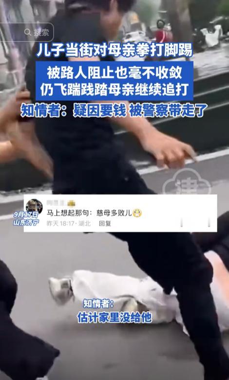 太痛心了!山东,一男孩向母亲要钱,因母亲没有给,男孩便在众目睽睽下,对母亲大打出手,还将母亲飞踹在地,拦都拦不住,被打的母亲却一点都不带反抗,民警赶到现场后,男孩才停止对母亲的施暴! 在一个平常的日子里,一幕令人震惊的事件在山东济宁的街头悄然上演,随着视频的传播,这起事件迅速引发了社会对家庭教育失误的深刻反思与警醒。 许多网友在社交媒体上热议,如何有效教育孩子,避免溺爱与暴力的产生,这个看似普通的家庭暴力事件,暴露出更为复杂的社会与教育问题。 随着警察的到场,事态的发展终于迎来了转机,警察在接到报警后迅速赶到现场,目击者们纷纷围拢,见证了这一场不堪的冲突。 现场的气氛异常紧张,男孩的暴力行为已经达到了不可收拾的地步,目击者们只能目睹着这一切,无奈和愤怒交织在他们的心中,感受到无助和绝望。 在这场令人心痛的冲突中,令人震惊的是男孩的母亲在暴力面前显得异常冷静,尽管身处危机之中,她的脸上并没有流露出应有的愤怒和抵抗。 面对自己的孩子,尽管遭受了拳打脚踢,母亲却始终保持着一种令人费解的纵容态度,这种反应让周围的人倍感困惑和不安,仿佛这一切在她的眼中都不过是日常的一幕。 她的态度不仅让路人感到震惊,更让人深刻思考家庭教育的种种问题,正是这种冷漠的态度,反映出教育中的严重缺失和对暴力行为的无视。 随着事件的推进,男孩的暴力行为愈发升级,初始的怒吼和谩骂逐渐演变为对母亲的猛烈攻击,肆无忌惮的举动让在场的每一个人都心生不安。 他的拳头狠狠地落在母亲的身上,仿佛每一击都在宣泄着他心中压抑已久的愤怒与不满,旁观者中有人试图制止这一切,有人出于本能冲上前去拉开这个失控的男孩,但他却如狂风暴雨般毫不留情地继续施暴。 这样的场景,令在场的每一个人都感到不寒而栗,内心的愤怒与无奈交织成一幅悲惨的画面,这一幕并不是偶然,而是男孩与母亲之间长期积累的问题的集中爆发。 事件的起因相对简单:男孩因向母亲索要生活费未果而愤怒,随即展开了这一场闹剧。 但这样的激烈反应,显然背后隐藏着更深层次的家庭关系紧张和教育缺失,随着生活条件的改善,孩子们往往被父母视为“心头肉”,一味的溺爱与过度保护反而扭曲了孩子的性格与价值观。 这种畸形的爱让男孩习惯于一切都由父母提供,而当遭遇拒绝时,他便会毫不犹豫地选择暴力来发泄情绪。 在这样一个物质充裕的时代,许多家庭都在无意识中放任了孩子的过度消费与无理取闹,导致孩子无法承受挫折,缺乏应对生活挑战的能力。 事发当天,男孩的失控行为正是这种家庭教育缺失的一个缩影,他习惯于父母对自己的包容与迁就,任何对他意愿的拒绝都会成为他愤怒的导火索。 每一次的纵容,都在无形中将他推向了暴力的深渊,而他的母亲则是在一片温柔的包围中,对这一切视而不见。 随着事件的进一步发酵,社会上对于家庭教育的探讨愈加热烈,人们开始反思,溺爱是否真的意味着爱,还是一种变相的伤害? 许多网友表达了自己的观点,强调家庭教育中的原则与界限,溺爱不是爱的体现,而是剥夺孩子学会尊重他人、控制情绪的机会。 正是这种缺乏自律与对他人感受的忽视,让孩子失去了面对社会的能力,导致了极端行为的发生。 这一事件引起了广泛的关注,家庭教育的问题不再只是个别家庭的困扰,而是关乎社会整体发展的重要议题。 社会各界人士纷纷发表看法,认为父母在孩子成长过程中承担着不可推卸的责任,作为孩子的第一任老师,父母的言行举止都在潜移默化中影响着孩子的人生观和价值观。 只有当父母意识到这一点,并努力改善自己的教育方式,才能避免更多类似的悲剧发生,最终,这起事件不仅仅是一个家庭的悲剧,更是整个社会的警钟。 它提醒着我们,教育不仅关乎个体的成长,更关乎整个社会的和谐与未来,家庭教育的重要性在于,不仅要给予孩子物质上的满足,更要让他们学会尊重他人、理解生活的艰辛。 只有这样,我们才能为下一代培养出有责任感、有同情心的公民,才能为社会的和谐发展奠定基础。 在这个充满挑战的时代,父母们应当反思自身的教育方式,努力寻找适合孩子的成长路径,只有在爱与严格的平衡中,才能帮助孩子走出一条健康成长的道路。 这个事件的发生,再次唤起了每一个家庭对于教育责任的重视,希望在未来,我们都能以此为戒,共同努力,为孩子们创造一个更加良好的成长环境。 信息来源:延边晨报——近日,山东济宁一男孩当街踹翻母亲并踩踏,多人阻拦未果,警方介入