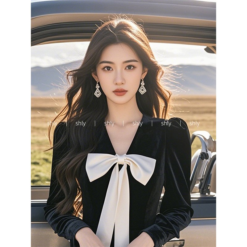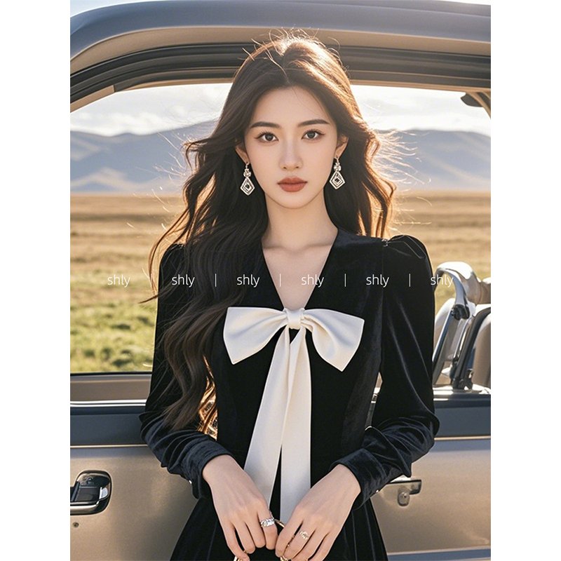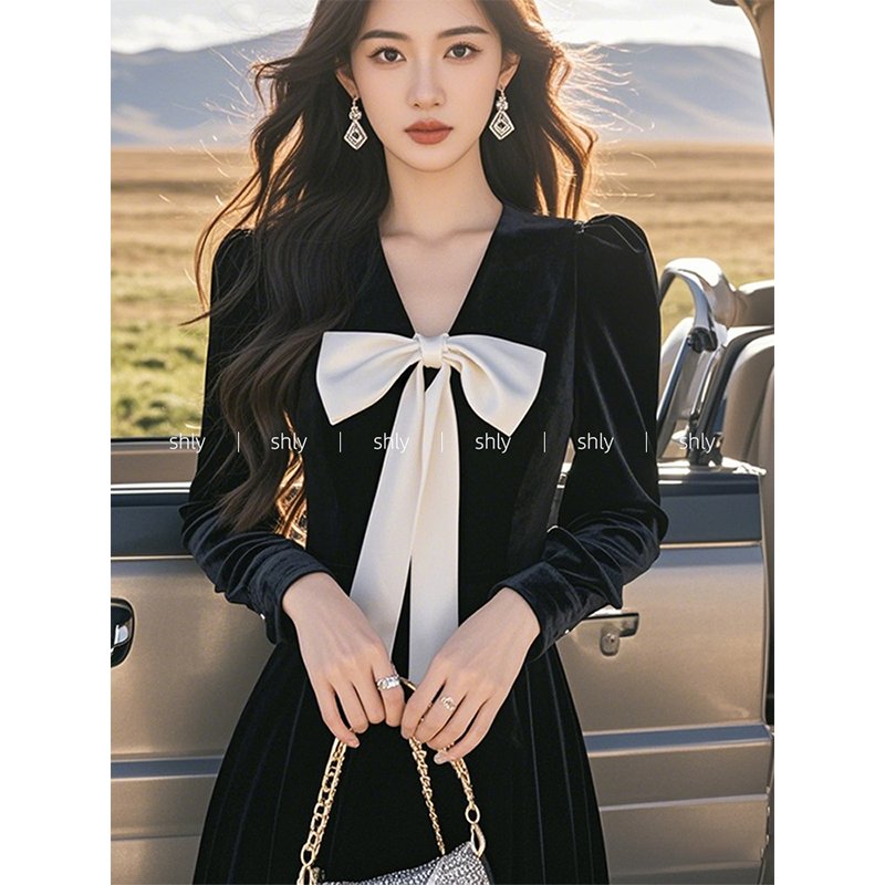 秋季2024年新款女装法式赫本风重要场合黑色丝绒长袖连衣裙子长裙