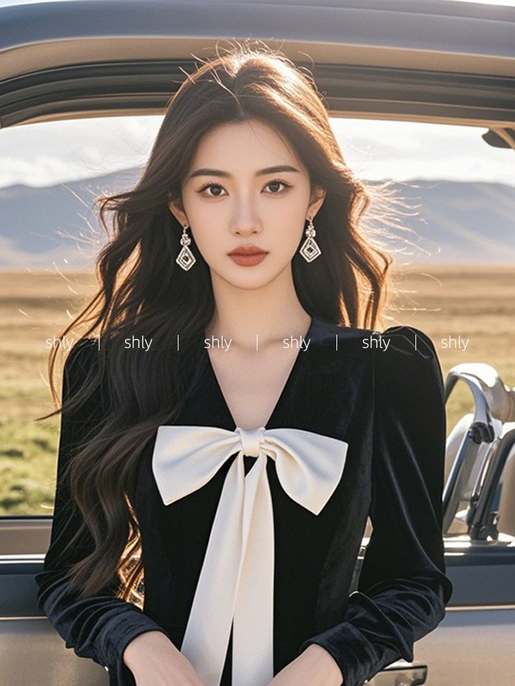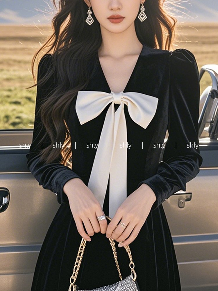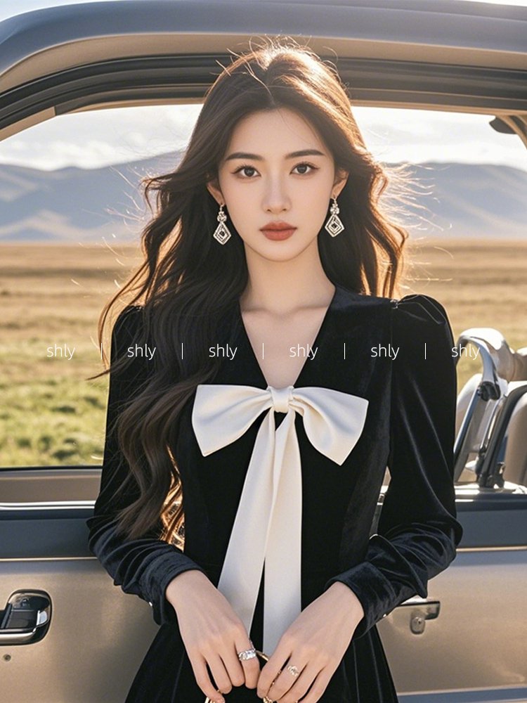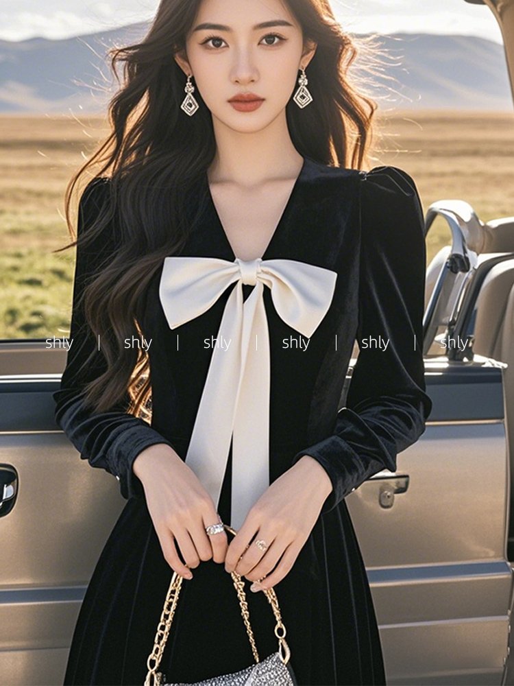 法式赫本风重要场合黑色丝绒长袖连衣裙子