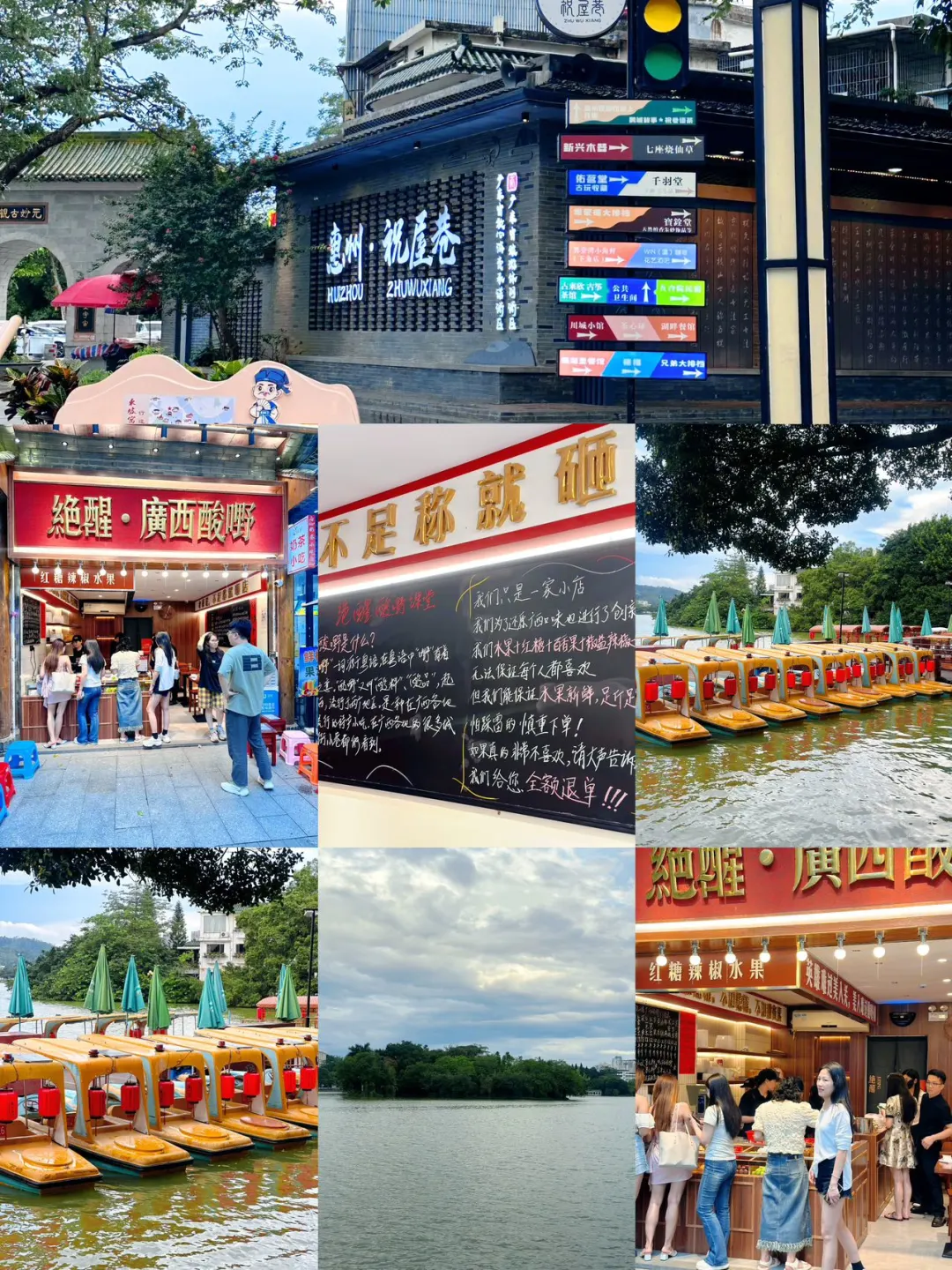 来惠州旅游的宝子们 都给我看过来啦~~ 推荐你们一个好去处 就是西湖旁的祝屋巷 这里不仅可以看到西湖美景 还可以逛祝屋巷 吃喝玩乐都有的!! 真的很好逛 - 特别推荐这家绝醒广西酸嘢 在惠州也能吃到正宗的广西酸嘢 真的好爱! 本惠州人也隔三差五的来吃!!! 真的停不下来 酸酸辣辣很开胃 加上辣椒 香菜 一开始以为会很雷 吃过之后才知道到底有多绝绝子!! 来这里必冲这家! - 湖边项目划船也很不错 欢迎大家来体验惠州人文风情 地址:惠城区慈云路14号 店名:绝醒广西酸嘢(西湖店)