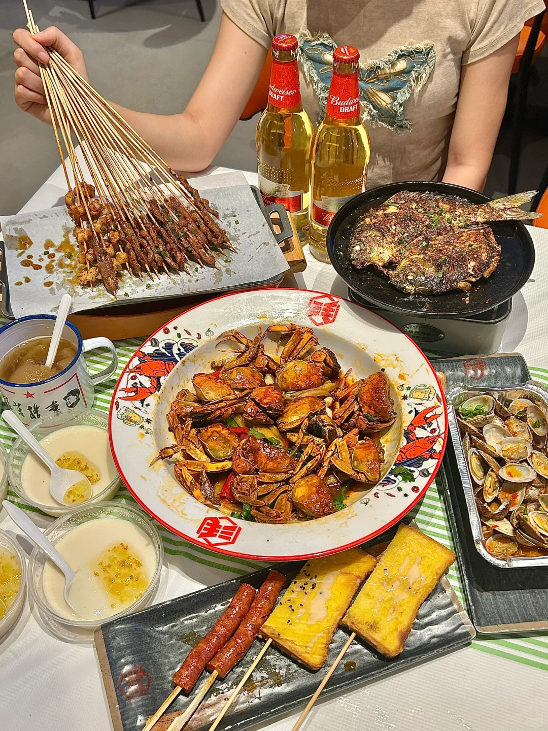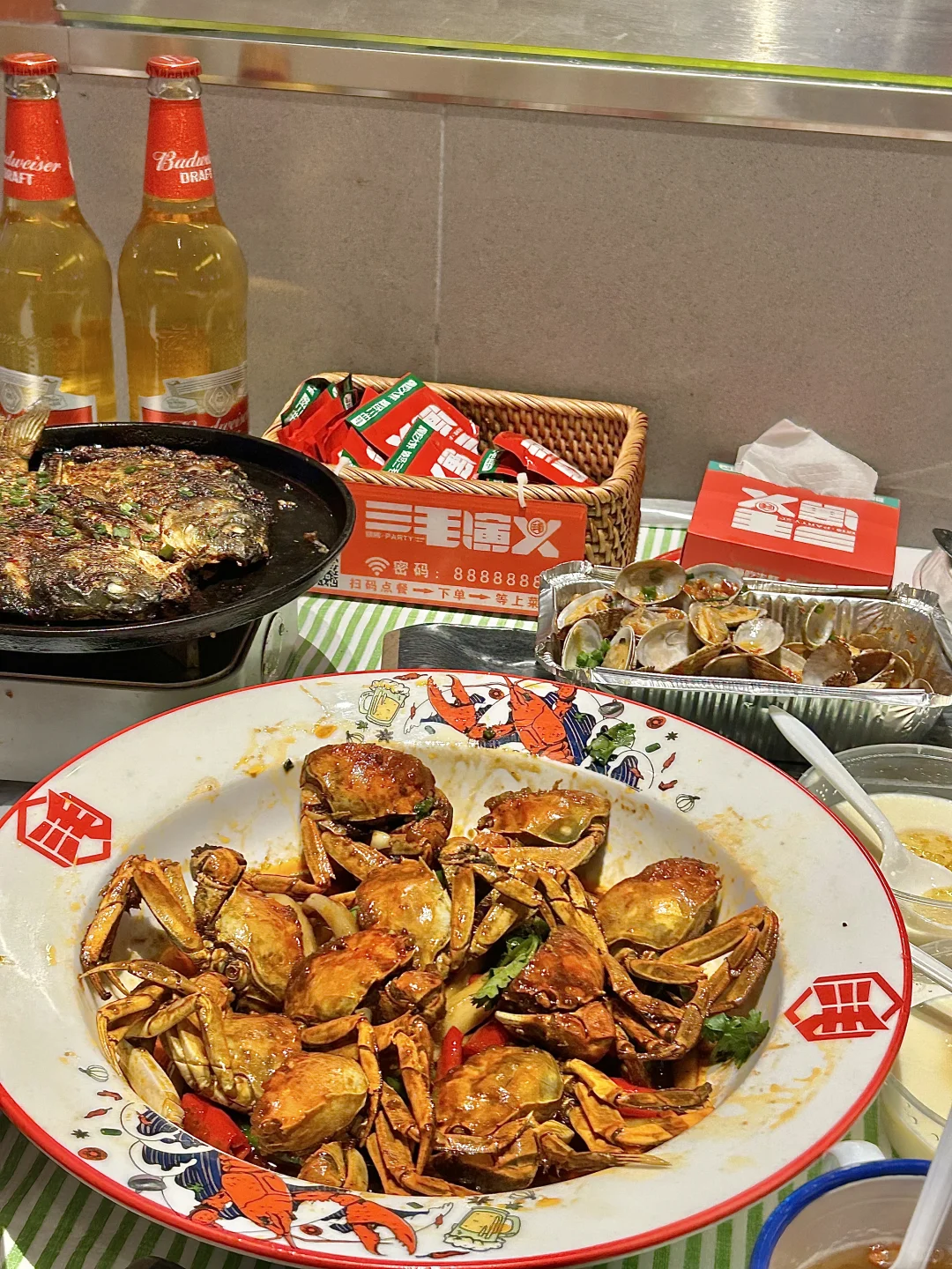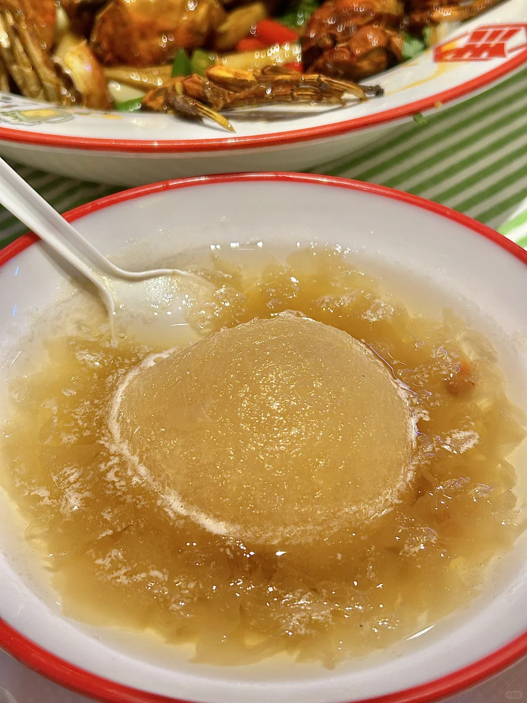 洋湖湿地公园附近的一家夜宵店,建议李自健美术馆打卡后直奔这里! 🌈店面很大,整个用餐体验都很舒适~必点菜品:一个烤梨✅油焖大闸蟹✅锡纸花甲✅湘西小串✅ 🍐烤梨和银耳一起煮的,软软乎乎又稠密,非常健康的一款糖水~ 🦀️油焖大闸蟹,切成两半的螃蟹裹着一层生粉,蟹肉口感更嫩,蟹黄粉粉的,很是下饭 ✔️锡纸花甲,花甲处理的很干净,珊瑚椒油的味道和辣味融在一起,超香! 湘西小串也是没雷点,鸡脆骨吃起来太香啦!