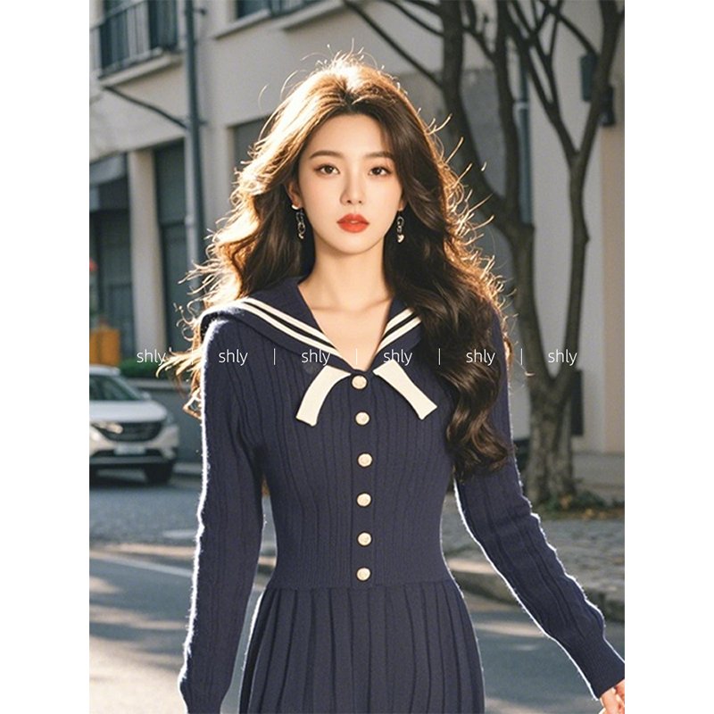 韩系氛围感穿搭藏蓝色海军领针织长袖连衣裙