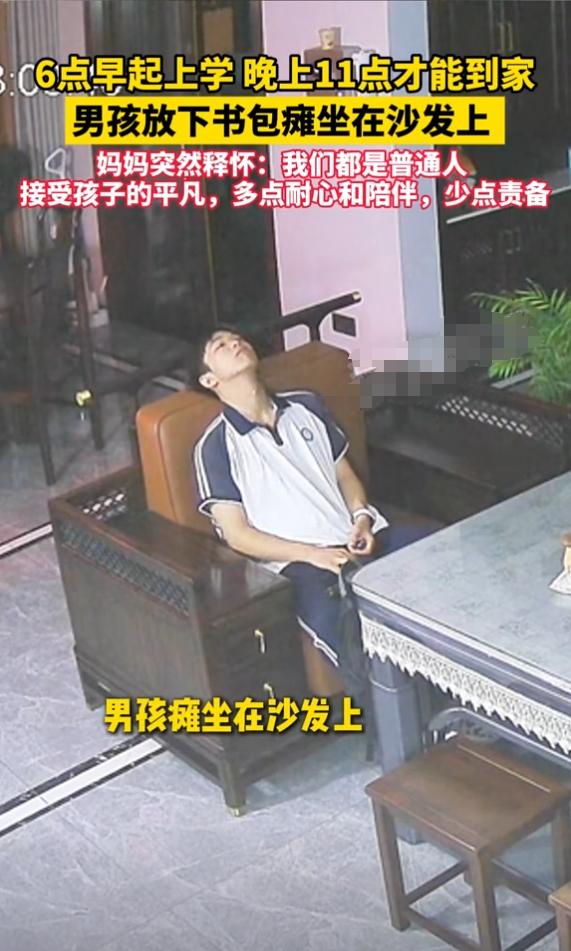“这个妈妈火了!”男孩每天早上6点起床上学,晚上11点才能回家!妈妈半夜看到一脸疲惫的儿子,心里突然释怀了! 在当今快节奏发展的社会环境下,家长和教育者对于孩子的教育期望呈现出日益增高的态势,学业压力也随之不断加剧。 在竞争激烈的大背景下,孩子们被卷入了一场似乎永无止境的学业竞赛中,堆积如山的作业和频繁的课外培训占据了他们大量的时间和精力。 然而,时光流转,在教育实践的过程中,越来越多的家长开始从内心深处意识到,教育的根本目的绝非仅仅局限于让孩子在考试中获得高分,进而顺利进入名校。 他们逐渐领悟到,教育更应该着眼于培养孩子成为全面发展的人才,具备良好的品德修养、健康的身心素质、创新的思维能力和较强的社会实践能力等多方面素养。 这种认识的转变,并非凭空而来,而是深深来源于对孩子身心健康的真切关注,家长们目睹了孩子在高压下的疲惫与焦虑,开始担忧这种模式对孩子长远发展的不利影响。 同时,这也是对当前教育模式的深刻反思的结果,人们开始反思单纯追求成绩的教育方式是否忽略了孩子的个性发展和综合素质的培养。 国家政策也敏锐地捕捉到了这种社会需求的变化,为了切实减轻学生过重的学习负担,促进学生全面发展,教育部于 2021 年果断推出了“双减”政策,即大力减少学生作业负担和校外培训负担。 这一政策目标清晰明确,旨在打破传统教育的桎梏,为学生创造一个更健康、更平衡的学习和生活环境,让孩子们能够在轻松愉悦的氛围中茁壮成长,实现真正意义上的全面发展。 《教育法》中的相关条款也强调,教育必须为人民服务,为社会主义现代化建设服务,必须培养德、智、体、美全面发展的社会主义建设者和接班人。 这些政策的制定和实施,标志着政府对教育问题的重视及其解决问题的决心。 具体到家庭层面,在湖南的一个普通家庭里,一天晚上,她像往常一样查看监控画面,却看到了让她揪心的一幕。 只见自己的儿子在晚上 11 点才缓缓地出现在监控画面中,那疲惫的身影仿佛被一种无形的重担压着。 他的脚步拖沓,双肩微微下垂,脸上写满了疲惫与无奈,母亲看到这一幕,心猛地一揪,仿佛被一只无形的手紧紧握住。 她深知儿子每日在学业的海洋中拼搏,承受着巨大的压力,这个画面如同一记重锤,狠狠地敲在母亲的心上。 让她深刻地意识到孩子所面临的困境,也让她开始重新审视自己对孩子的教育期望和方式,思考如何在追求成绩与孩子的身心健康之间找到更好的平衡。 长时间的学习不仅使孩子身心疲惫,还严重挤压了他们的休息时间和个人兴趣的发展空间,影响了他们的全面成长。 全国性的学生压力调查数据显示,超过60%的中小学生每天的睡眠时间不足8小时,其中高中生的情况更为严重。 这些数据不仅揭示了学生普遍存在的睡眠不足问题,还暗示了过重的学习压力对学生健康的潜在威胁。 睡眠不足会影响学生的认知功能和情绪稳定,长期下去可能导致严重的心理和身体健康问题。 社会对这一问题的关注也在不断加强,湖南母亲的经历在网络上引发了广泛的讨论和共鸣。 许多网友表达了对孩子遭受如此重压的担忧,同时也对现行的应试教育模式提出了尖锐的批评。 他们认为,教育应该是帮助孩子发展个人兴趣,培养独立思考和解决问题的能力,而不是机械地追求分数和成绩。 这场讨论不仅限于家长和学生之间,教育专家、心理学家以及政策制定者也加入了讨论,他们提出,应对教育的方法和目标进行根本性的反思和调整。 学校需要根据每个孩子的兴趣和特点,提供更加个性化和灵活的教育方案,政府和教育部门应当通过政策支持,减轻学生的课业负担,提高教育质量,而不是单纯增加学生的学习时间。 家长需要调整自己的期望,更多地关注孩子的兴趣和情感需求,支持孩子发展成为一个全面发展的人。 通过这些措施,可以帮助孩子们在压力中找到自我,发展个人的潜能和兴趣,最终成为社会的有用之才。 这样的教育观念和方法的转变,虽然充满挑战,需要时间和耐心,但它将为我们的下一代创造一个更加健康、快乐和充满可能性的成长环境。 在这个过程中,每一个孩子的独特性和潜能都将得到充分的尊重和发展,这不仅是对个体的投资,更是对整个社会未来的投资。 信息来源:猛犸新闻2024年9月21日《6点早起上学 晚上11点才能到家,男孩放下书包瘫坐在沙发上 妈妈突然释怀》
