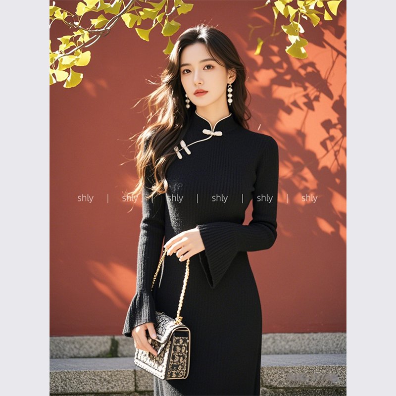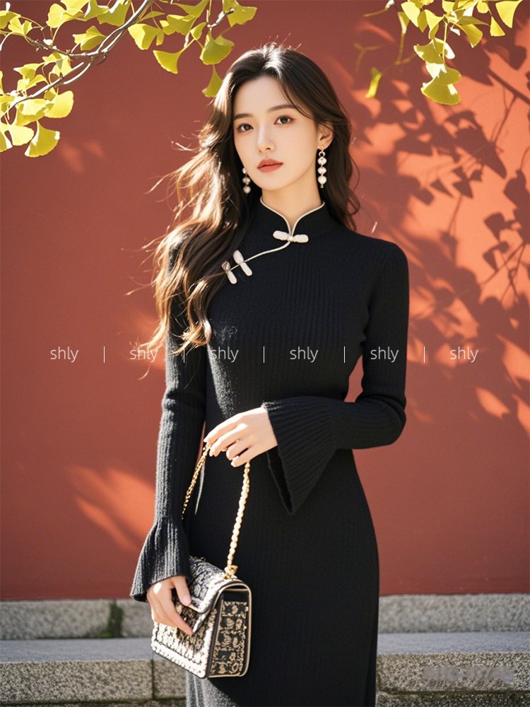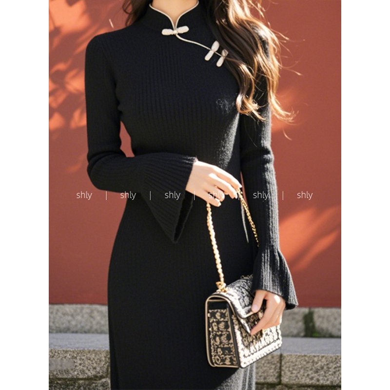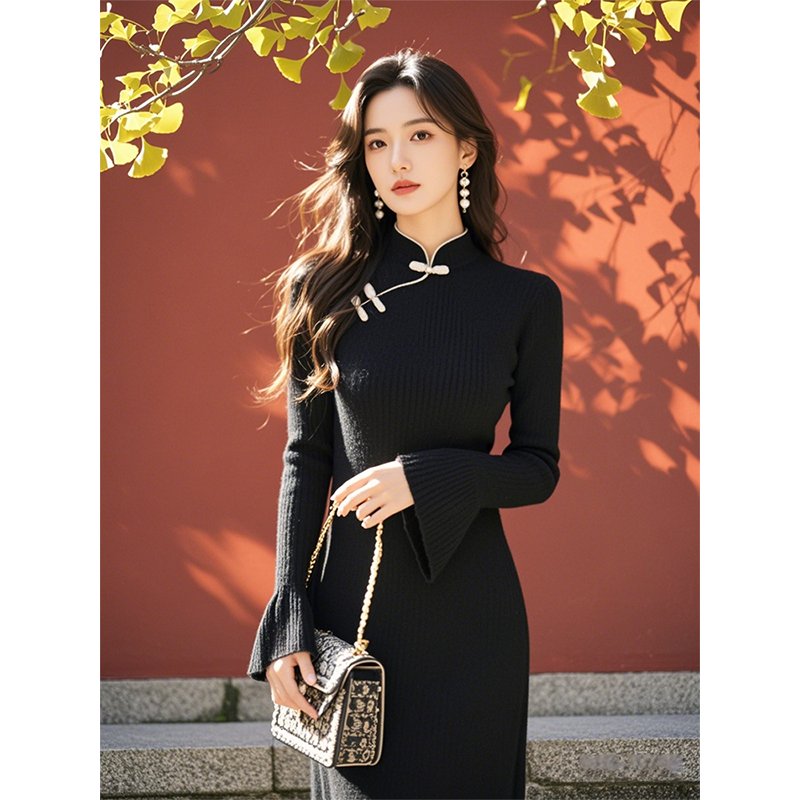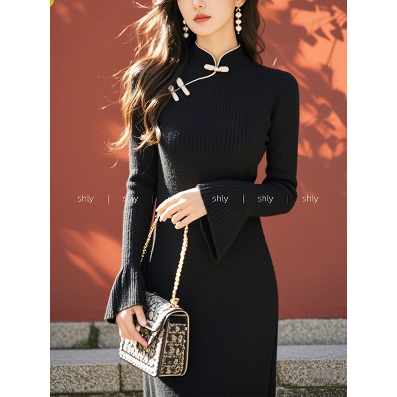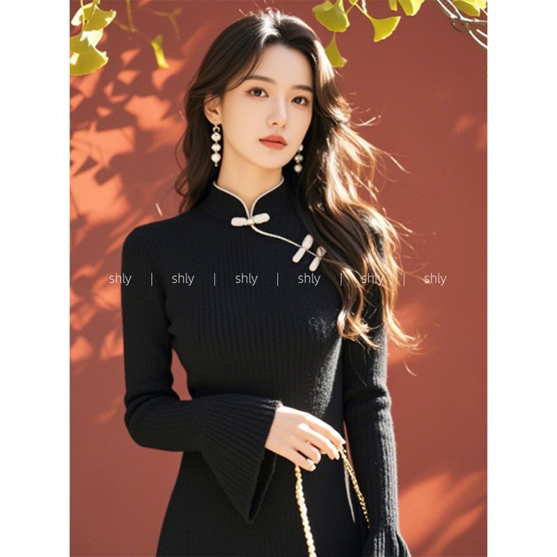 秋装女款2024年新款新中式国风黑色斜襟盘扣针织毛衣长袖连衣裙子