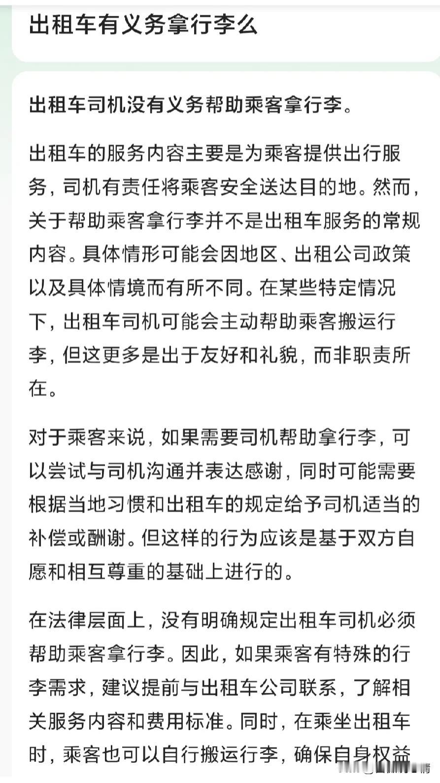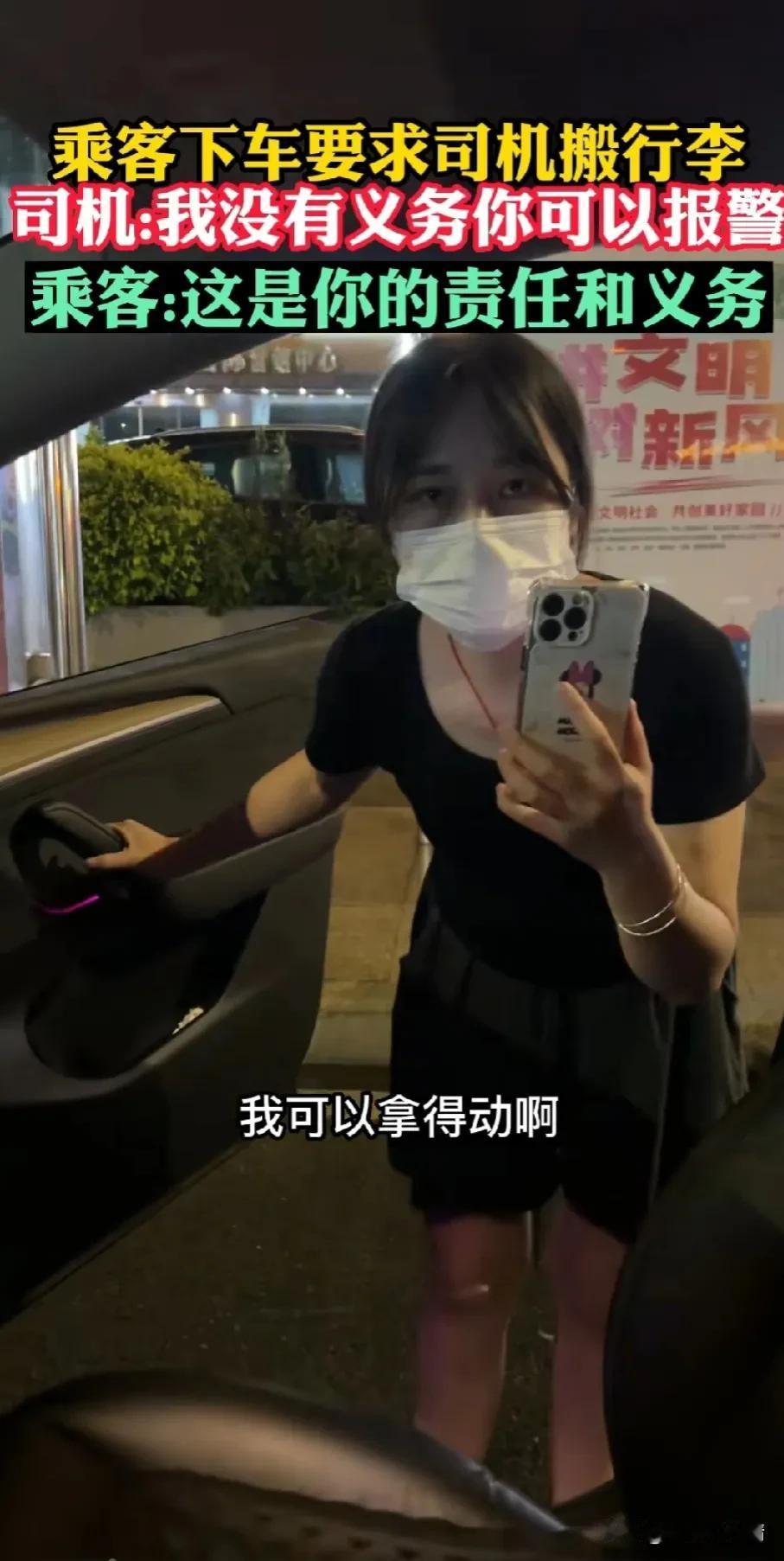 出租车司机有责任帮乘客拿行李箱吗 一位女士乘出租车,她在后备箱放了行李箱,下车的时候,即使行李箱她能拿得动,女士还是想让出租车司机帮忙拿下来,没想到司机拒绝了她。 感觉女士的态度不够友好,如果和气礼貌一点,用商量的口气请司机师傅帮忙,说不定师傅会帮忙,但是她有点咄咄逼人,好像还在录视频,司机态度也不好了,根本不为所动。 看到这个视频我感到有点疑惑了,到底司机师傅有责任和义务帮忙拿行李吗? #秋夜畅谈#
